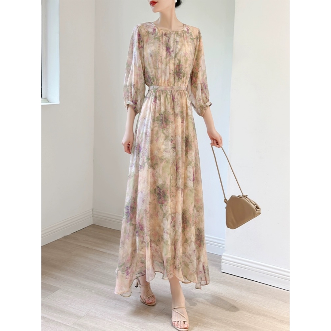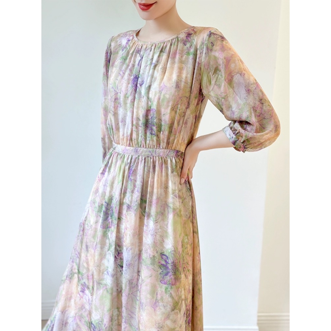 浪漫油画花朵印花 桑蚕丝法式A字收腰显瘦真丝连衣裙夏新款长裙子