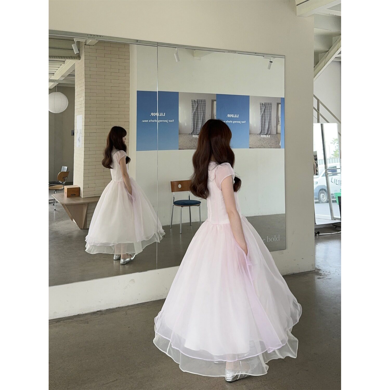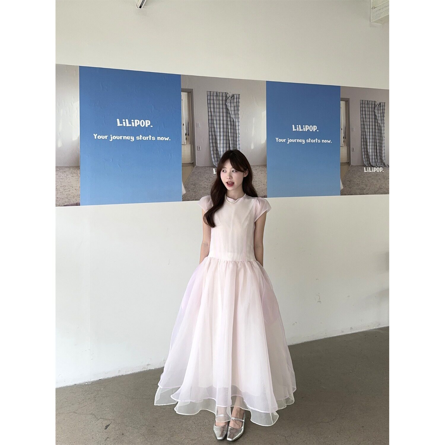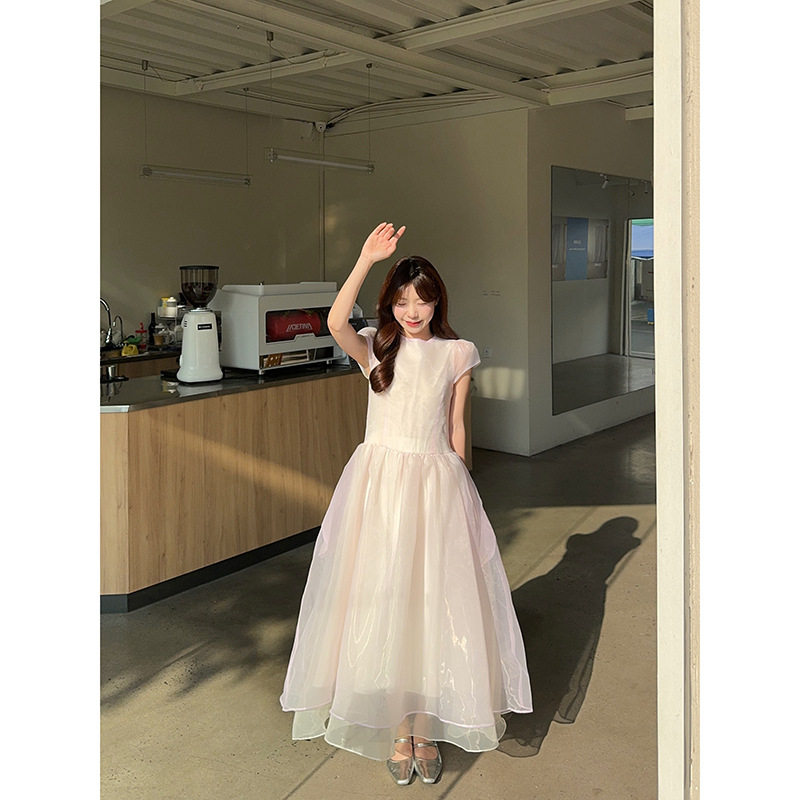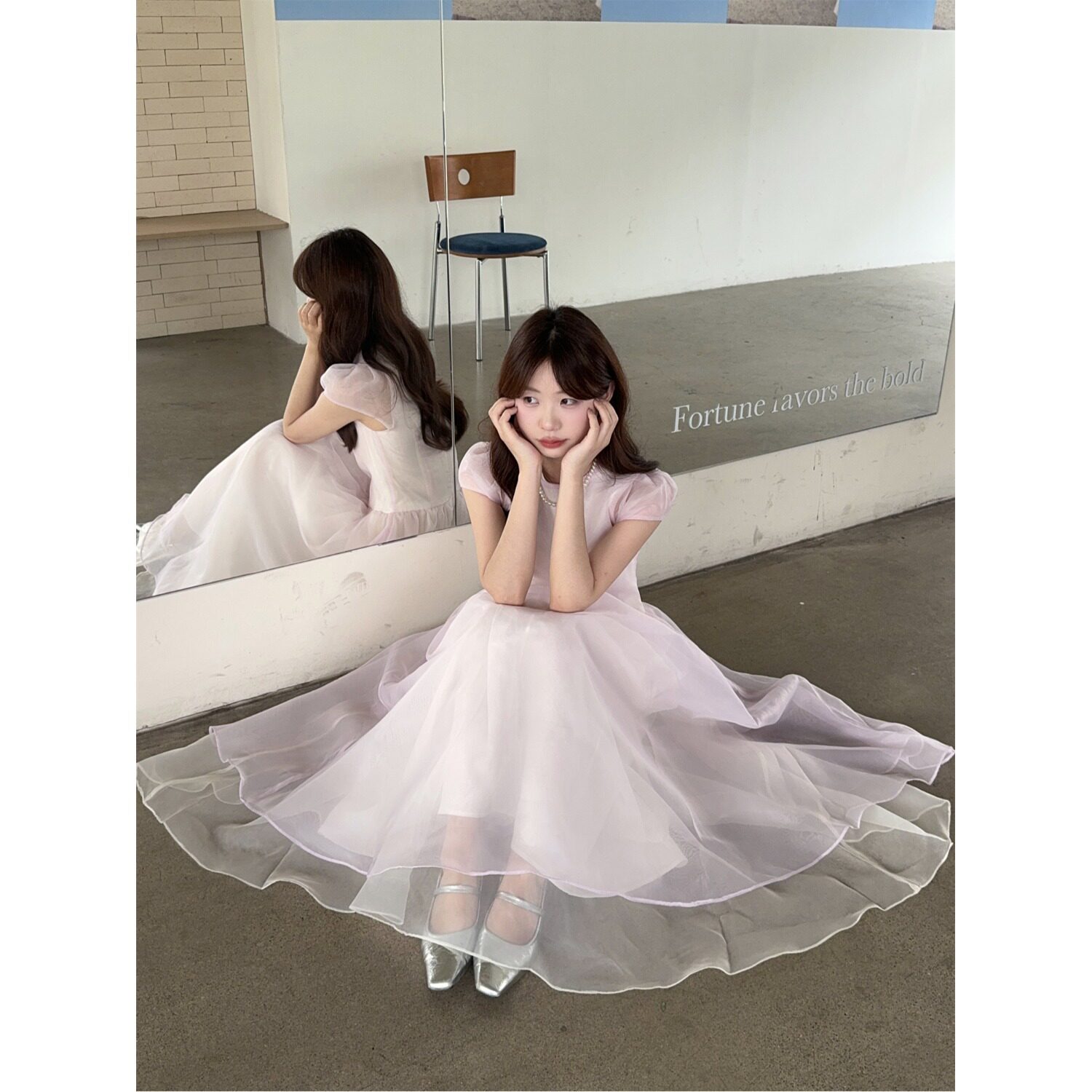 新款2025夏季甜美风网纱泡泡袖连衣裙女法式减龄收腰A字裙蓬包邮