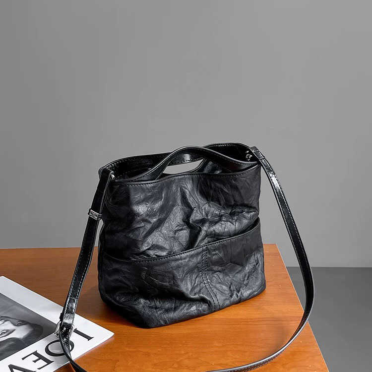 慵懒风小众褶皱水桶包女秋冬新款可手提女包头层皮单肩斜挎包真皮