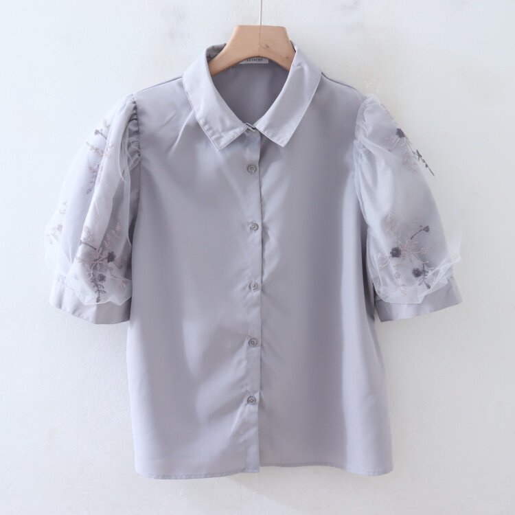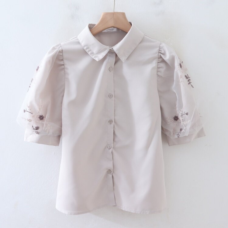 P090105日单新款客供料单排扣微宽松显瘦女气质纯色短袖刺绣衬衫