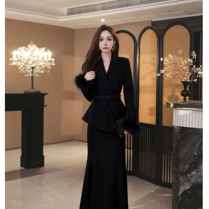 2025秋季新款加绒加厚法式气质西装外套半身裙套装两件套D4050