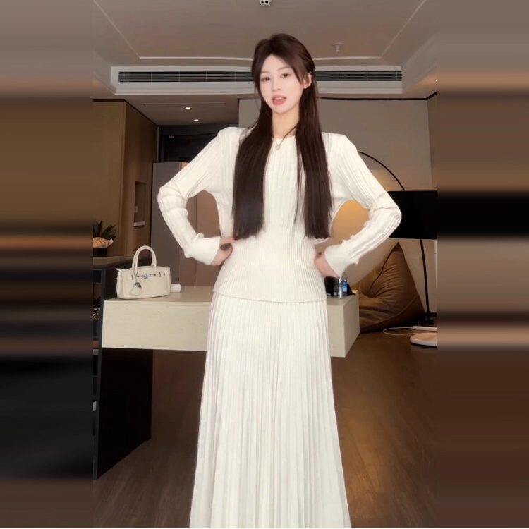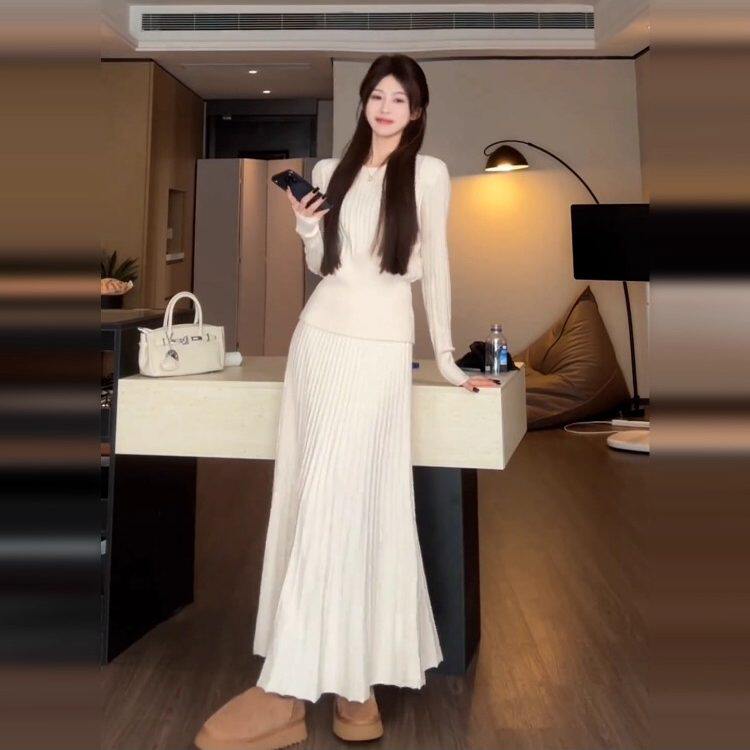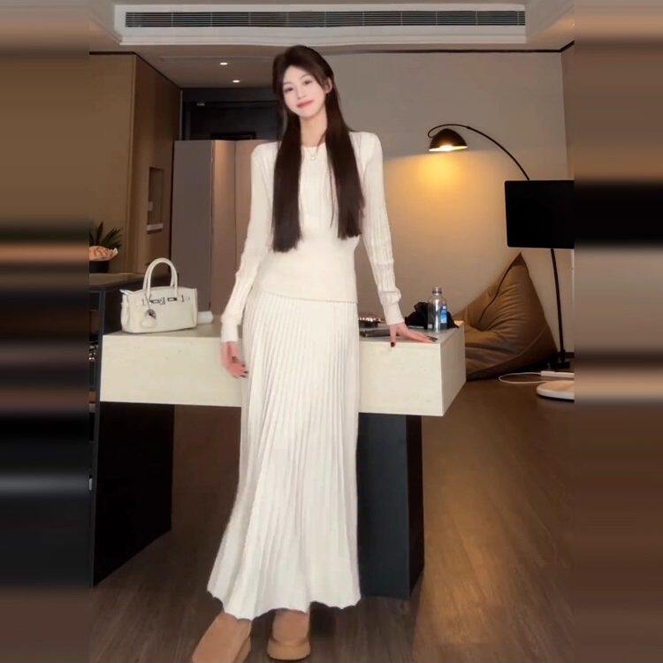 2025新款大方得体针织长袖连衣裙子女秋冬季内搭毛衣套装收腰长裙