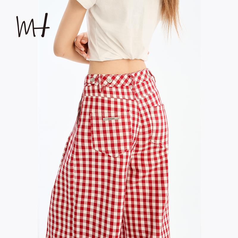 红色格子阔腿休闲裤女2025夏季薄款撞色高腰设计感宽松显瘦直筒裤