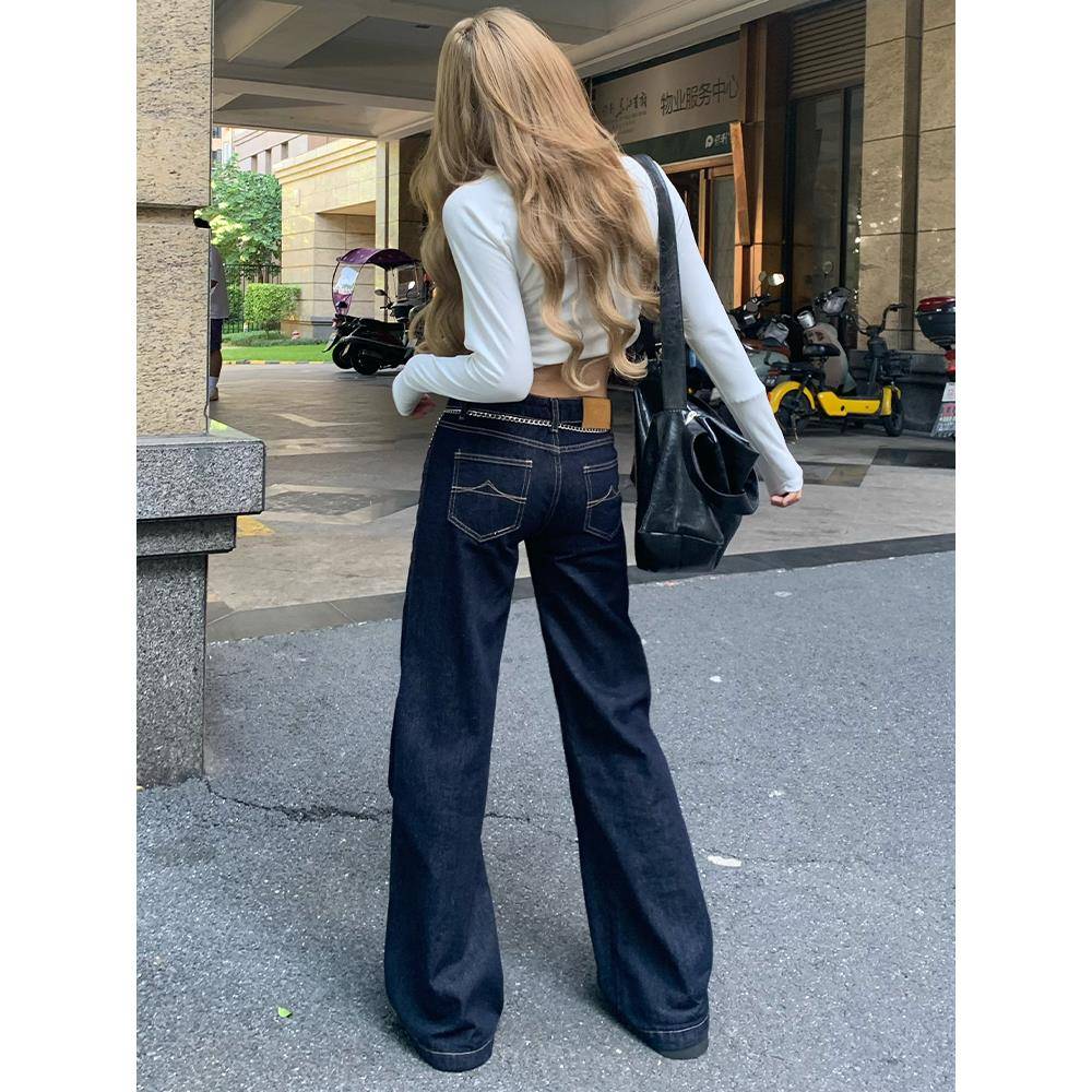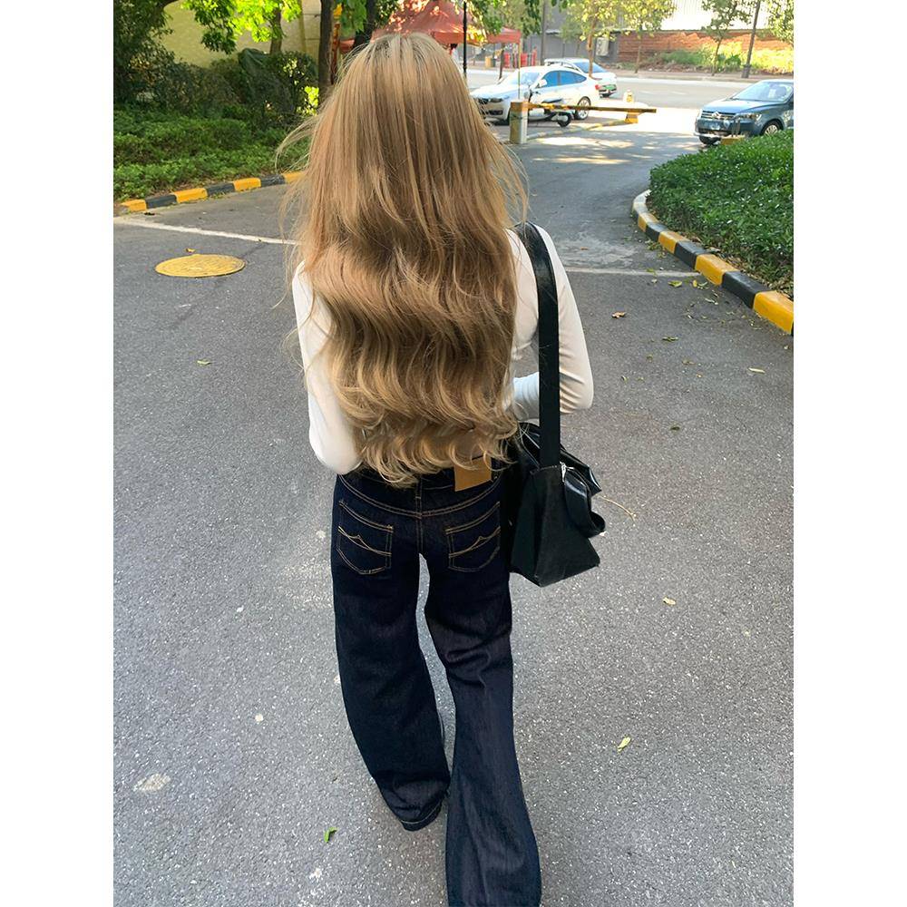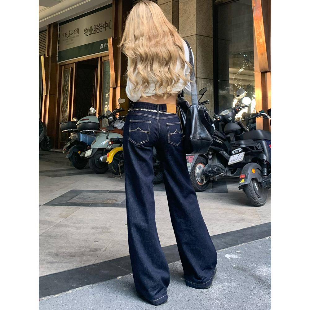 美式原牛色低腰微喇阔腿牛仔裤女春夏新款不贴腿宽松直筒拖地裤子
