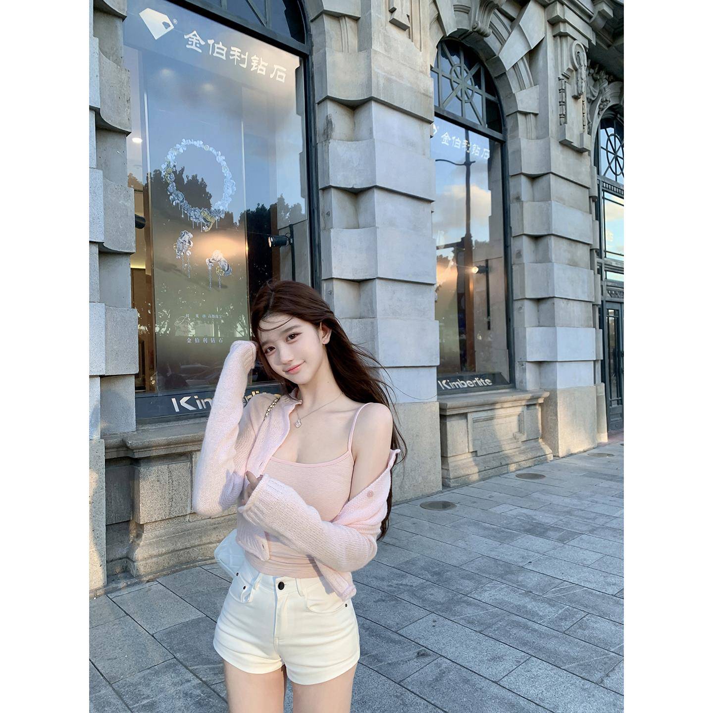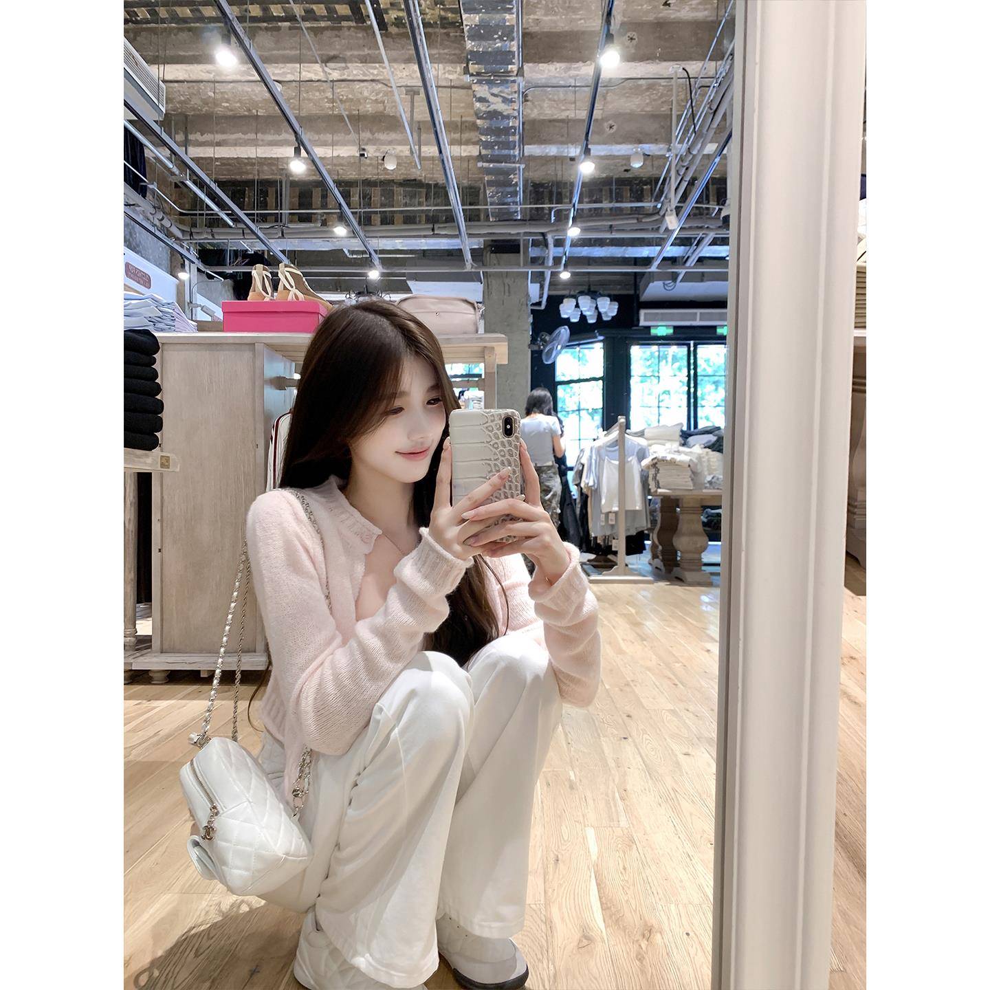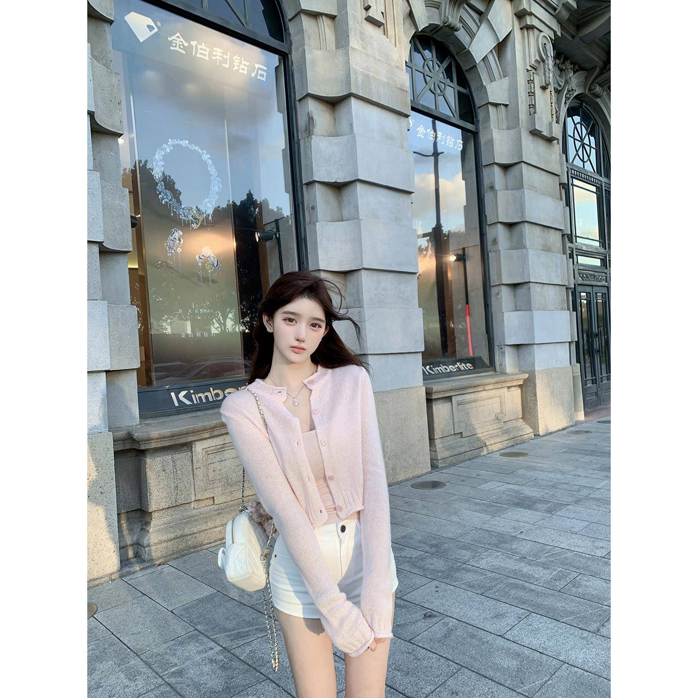 若语定制 樱粉少女修身气质樱花粉微透羊毛针织开衫外套早秋新款