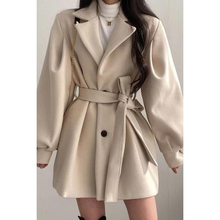 新款韩版秋冬装绑带气质小个子西装领赫本风中长款毛呢女大衣外套