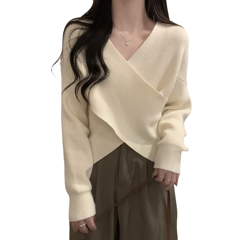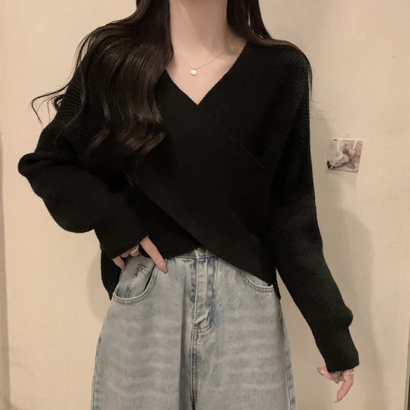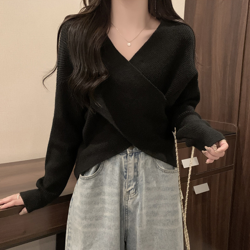 大尺码遮肚子V领交叉毛衣针织衫女秋冬胖mm修身显瘦内搭上衣打底