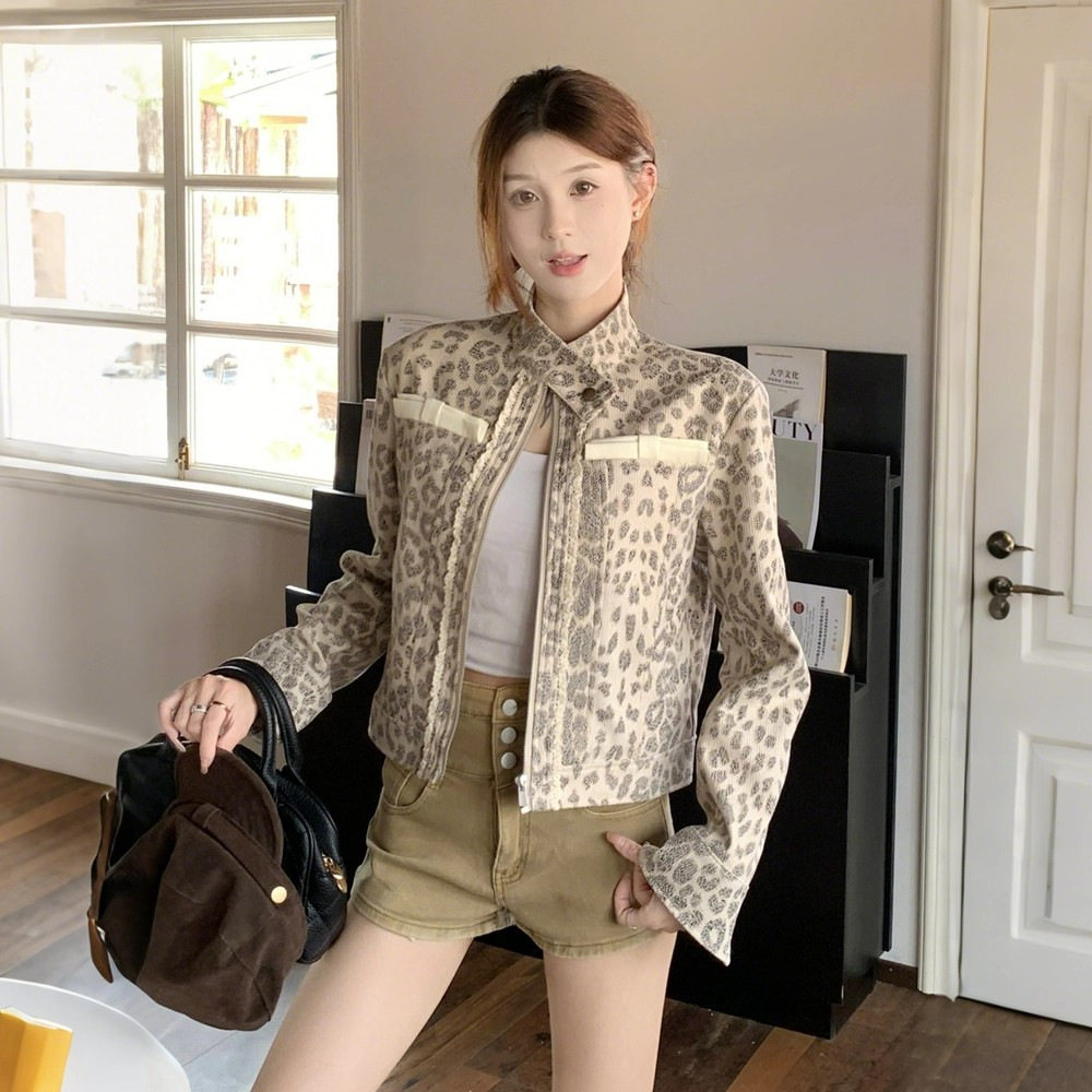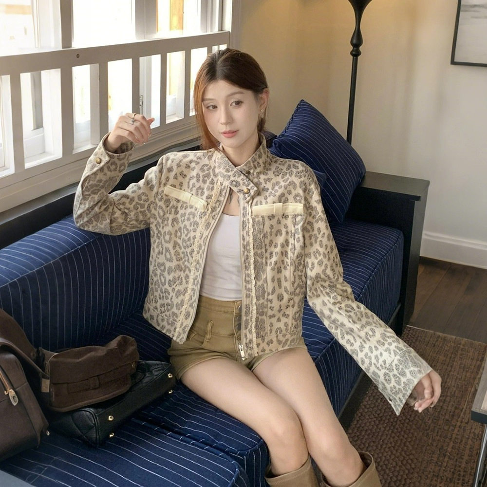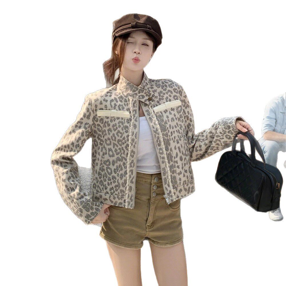 美式复古短款豹纹机车服限定小众做旧时尚立领夹克外套女小个子