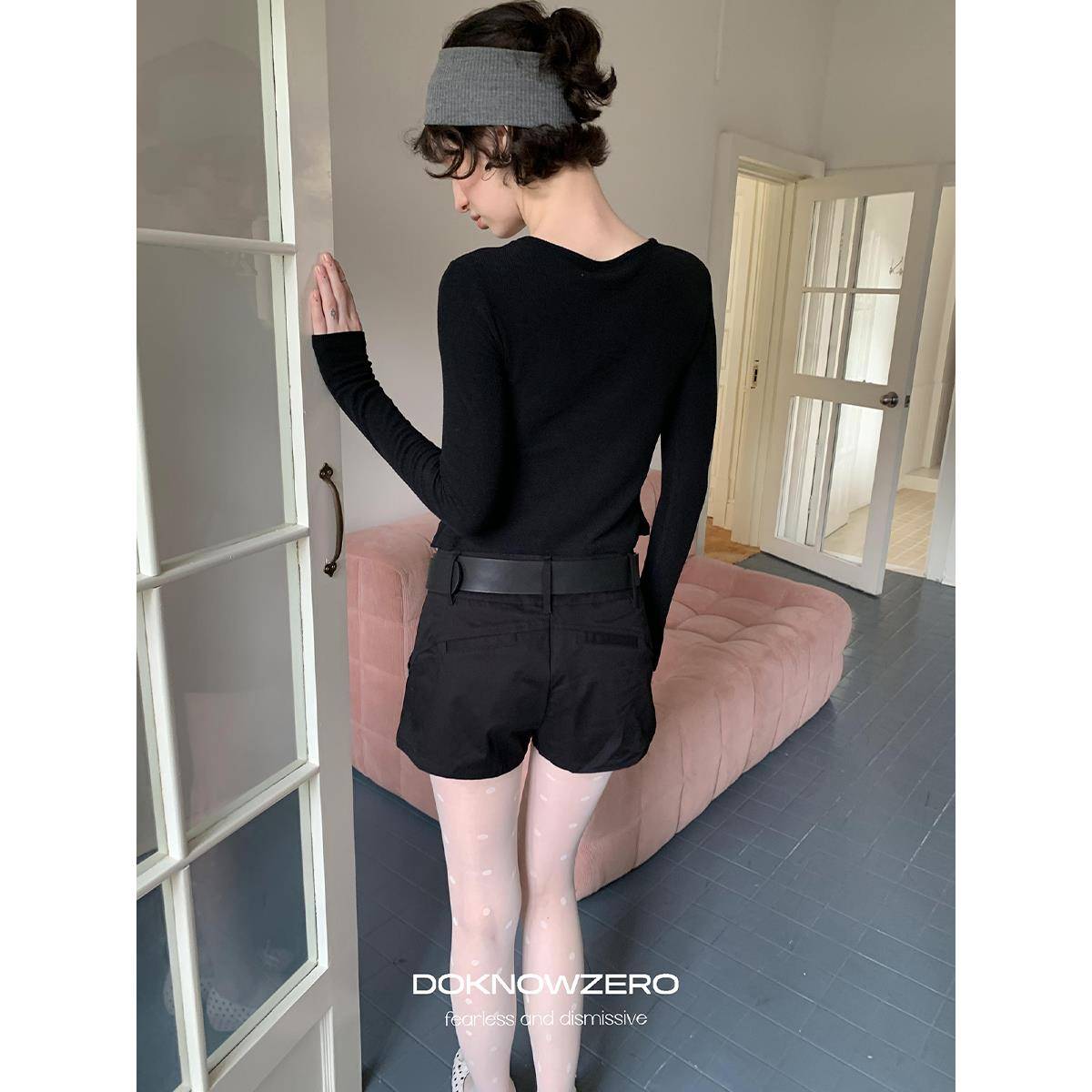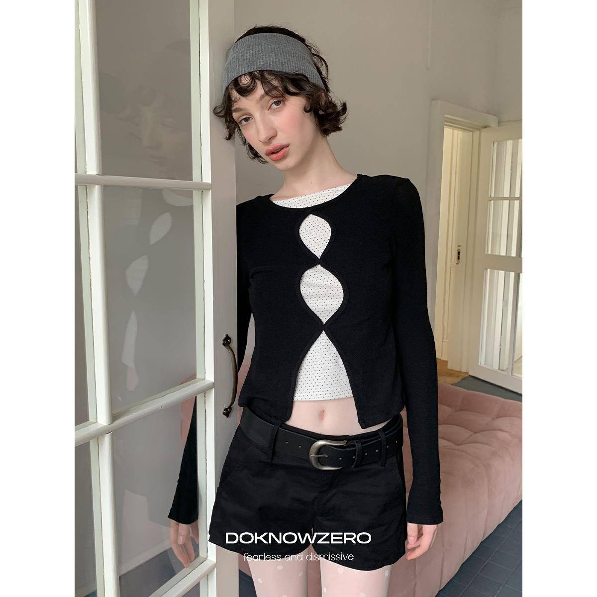 DKZ 假两件镂空波点长袖t恤女秋季新款修身针织上衣