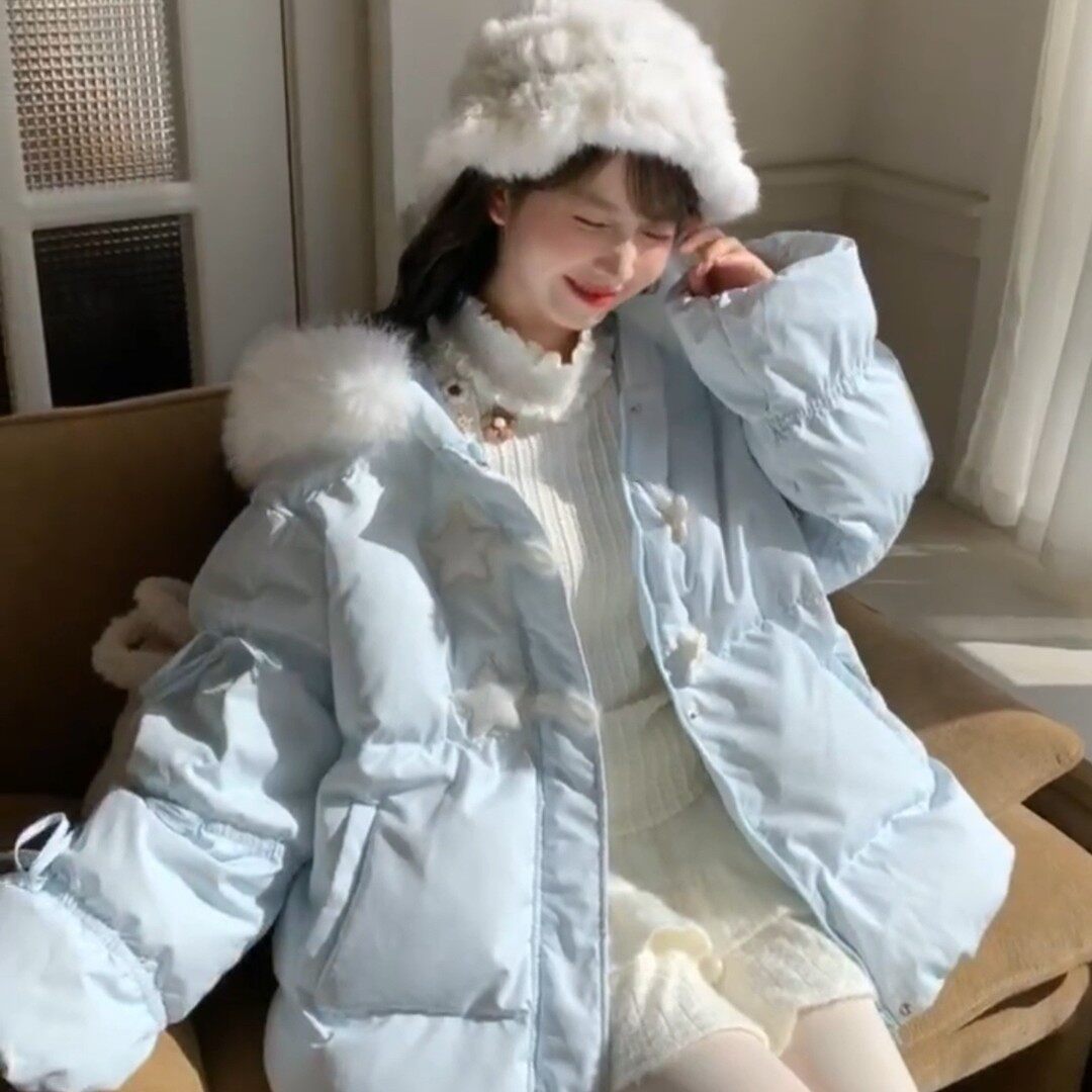 蓝色星星毛领连帽棉服外套女2025冬季新款加厚不臃肿宽松保暖棉袄