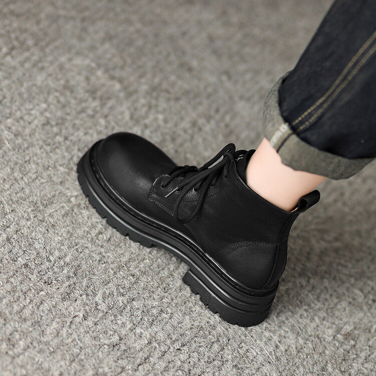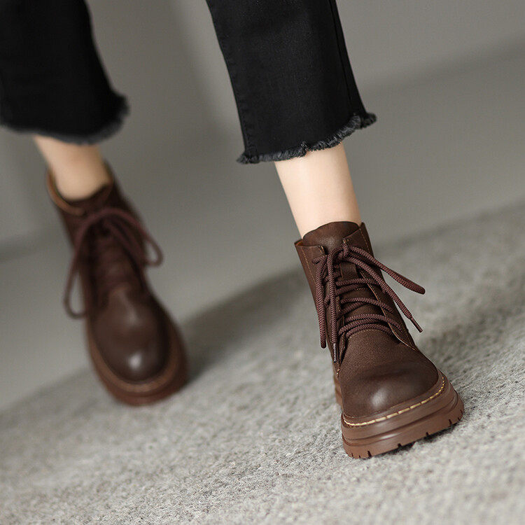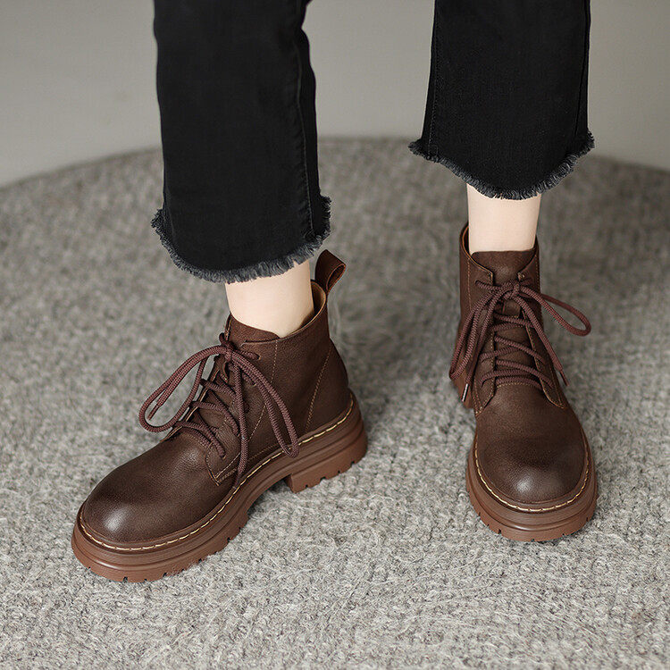 巨好穿~真皮圆头系带马丁靴女2025英伦复古棕色厚底短靴工装靴女