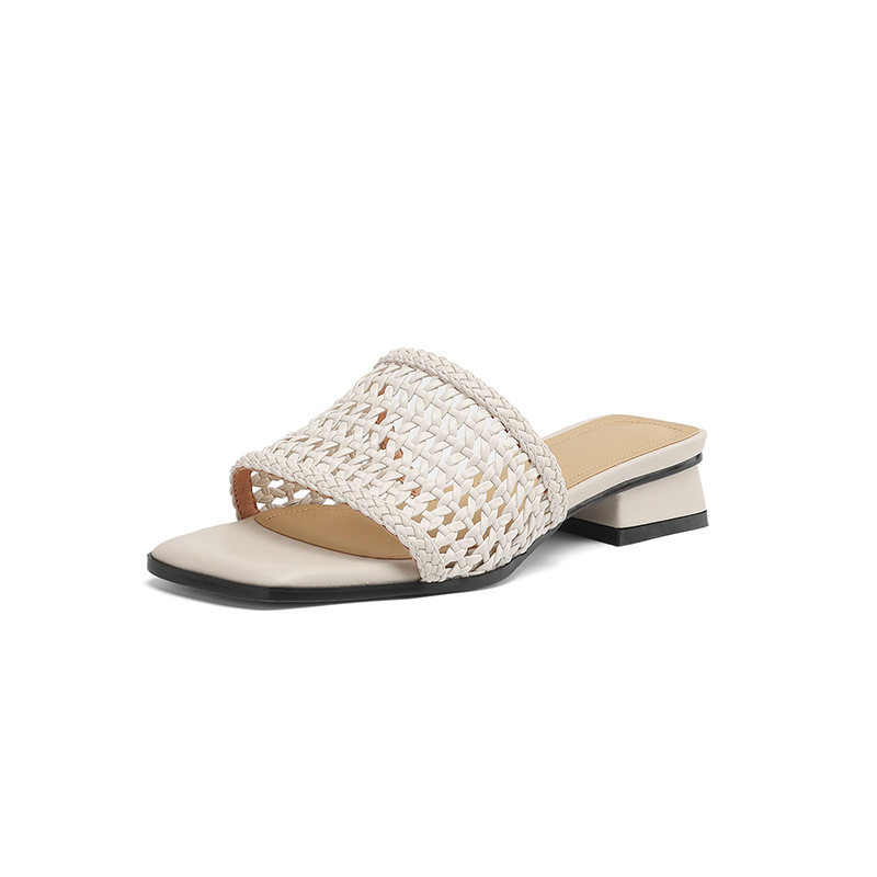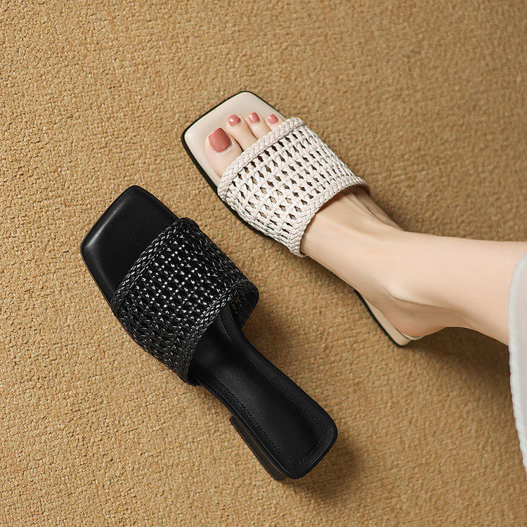 法式复古方头露趾编织镂空粗跟凉拖鞋女2025夏新款外穿软底黑白色