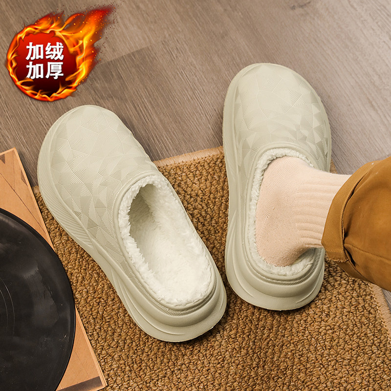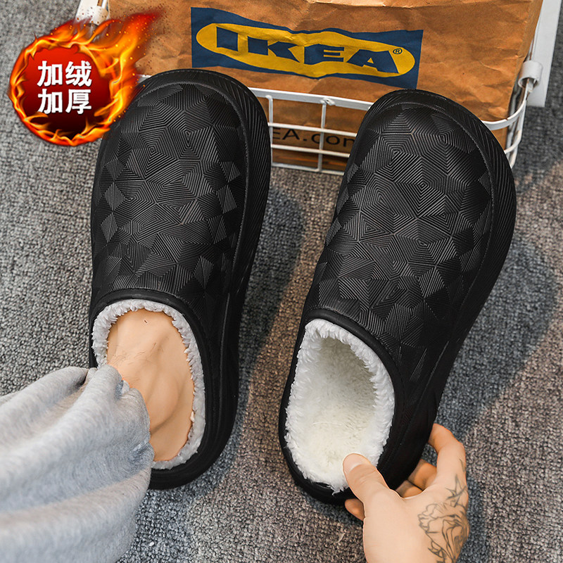 防水包头冬季加绒一脚蹬保暖防滑棉拖鞋拖鞋男黑色棉鞋男室内居家