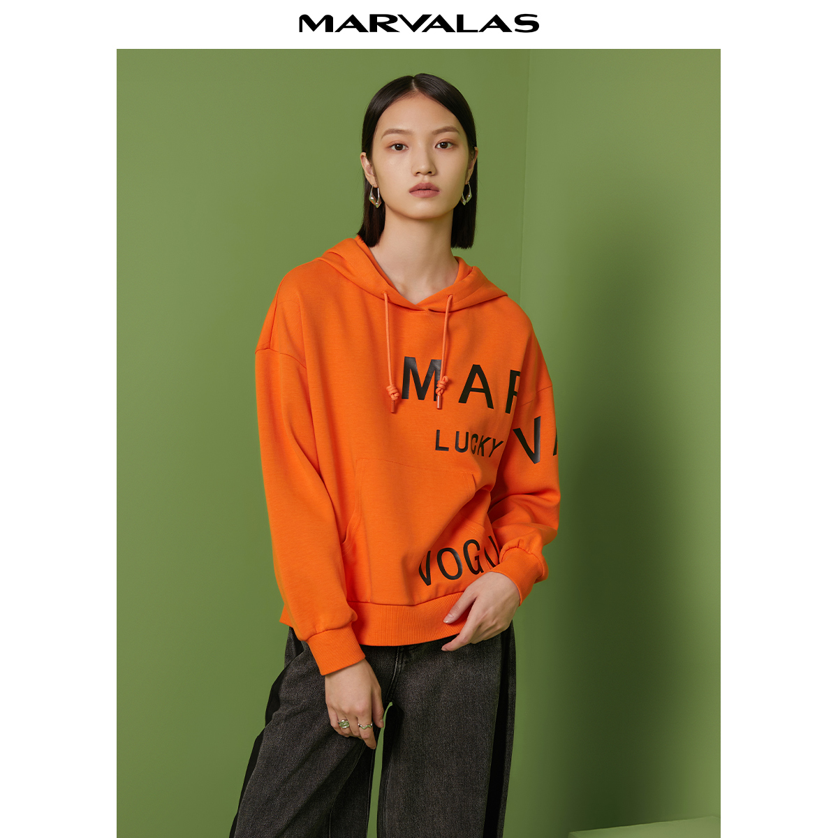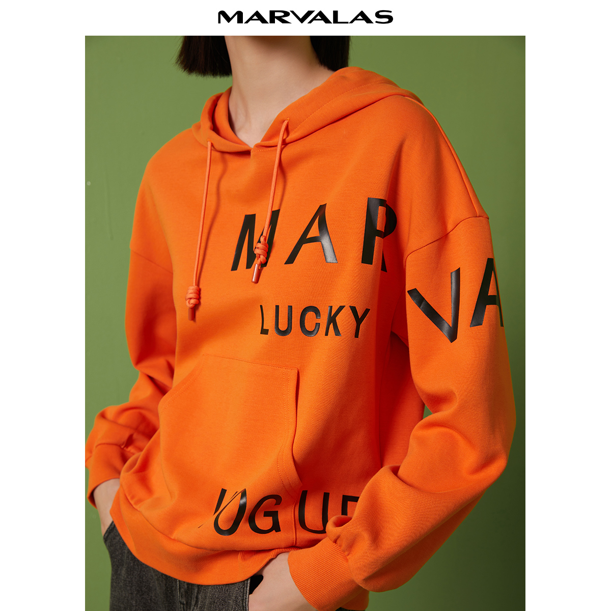 【呼呼严选粉丝专属】曼德诗连帽卫衣女2025秋新款字母印花宽松橙