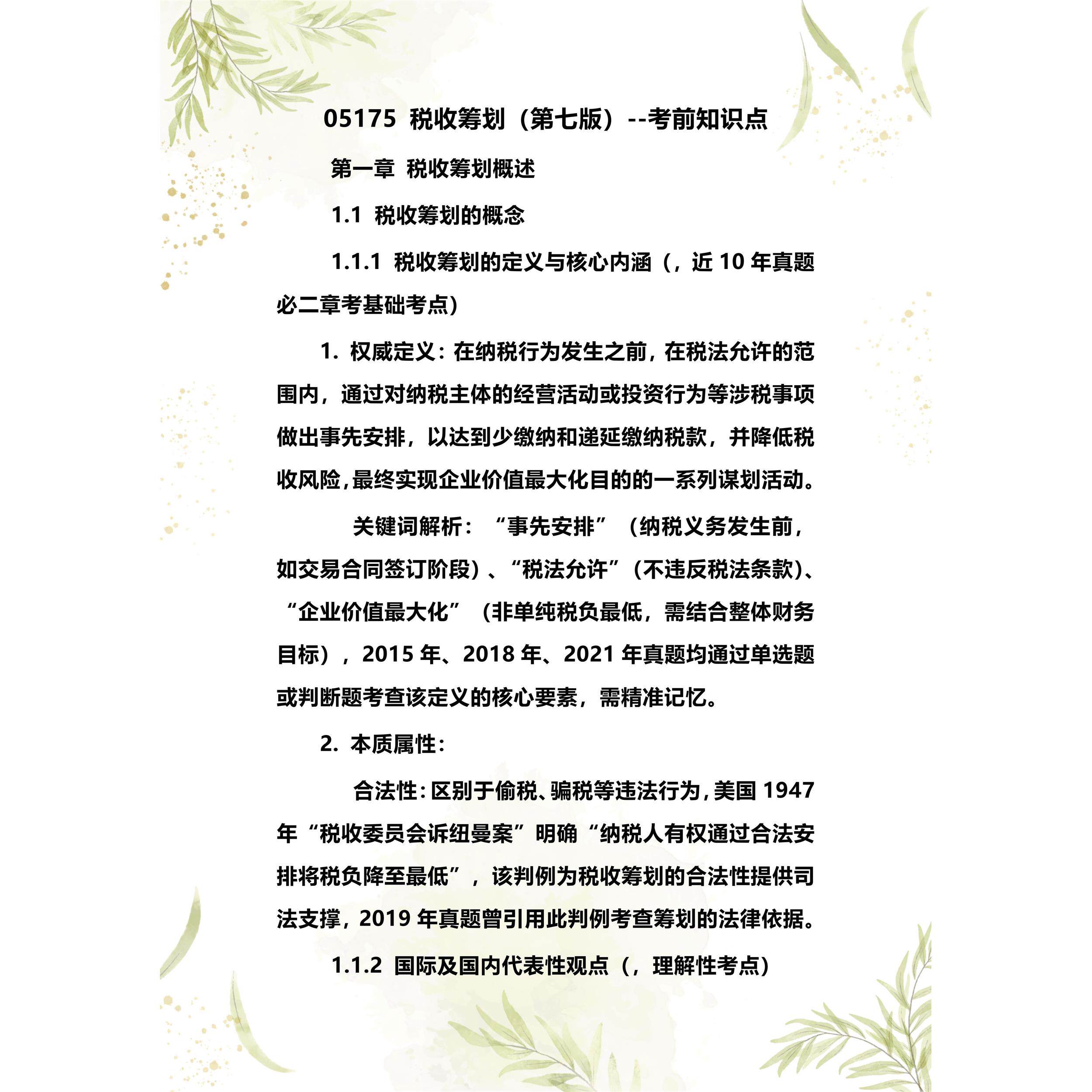 考点重点05175税收筹划(梁俊娇) 考纲讲解自考笔记 资料 自考复习过关思维导图 精讲视频网课 考前押题资料