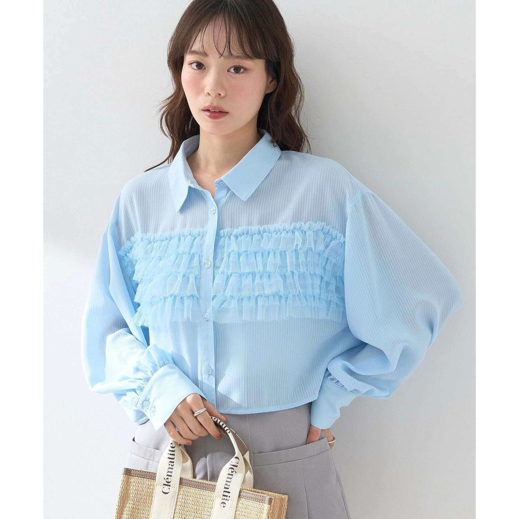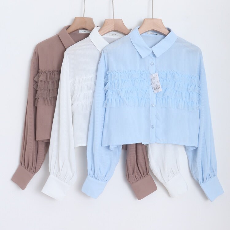 首页> 女装> D18077日单新款单排扣宽松显瘦网纱花边女纯色气质短款长袖衬衫