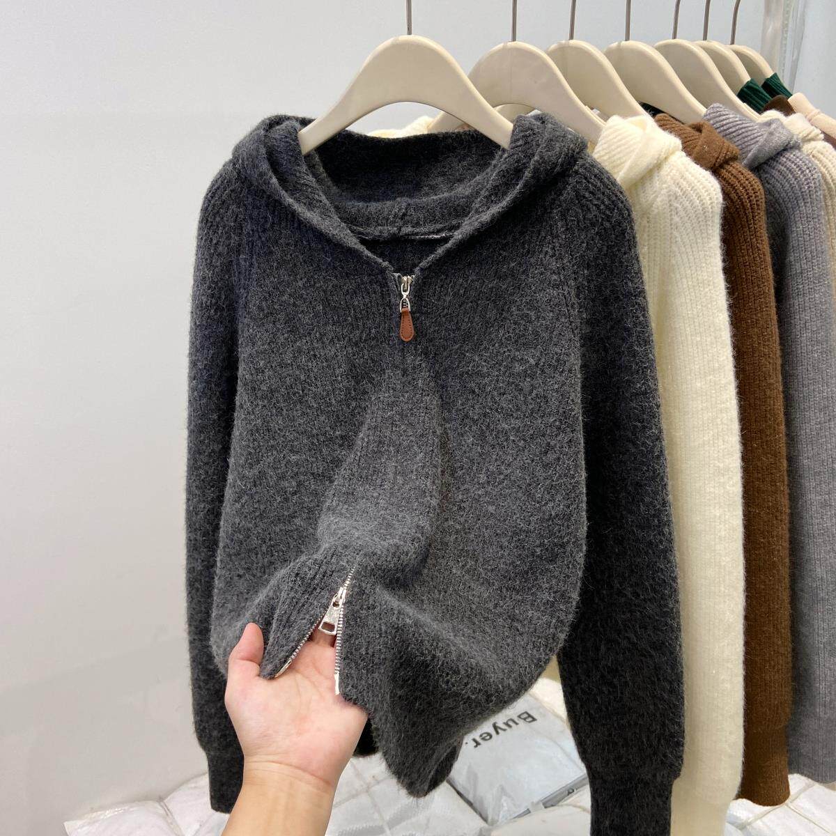 连帽双拉链开衫女春季秋冬加厚软糯毛衣美式慵懒chic外套宽松上衣