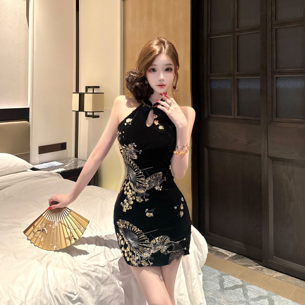 实拍新款辣妹性感复古国风挂脖亮片显瘦连衣裙