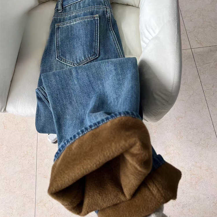 复古蓝秋冬加绒直筒牛仔裤女美式高腰宽松显瘦垂感百搭窄版阔腿裤