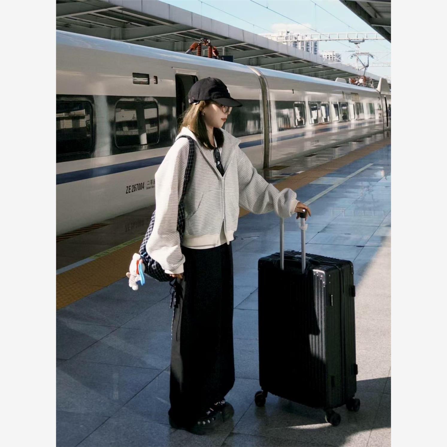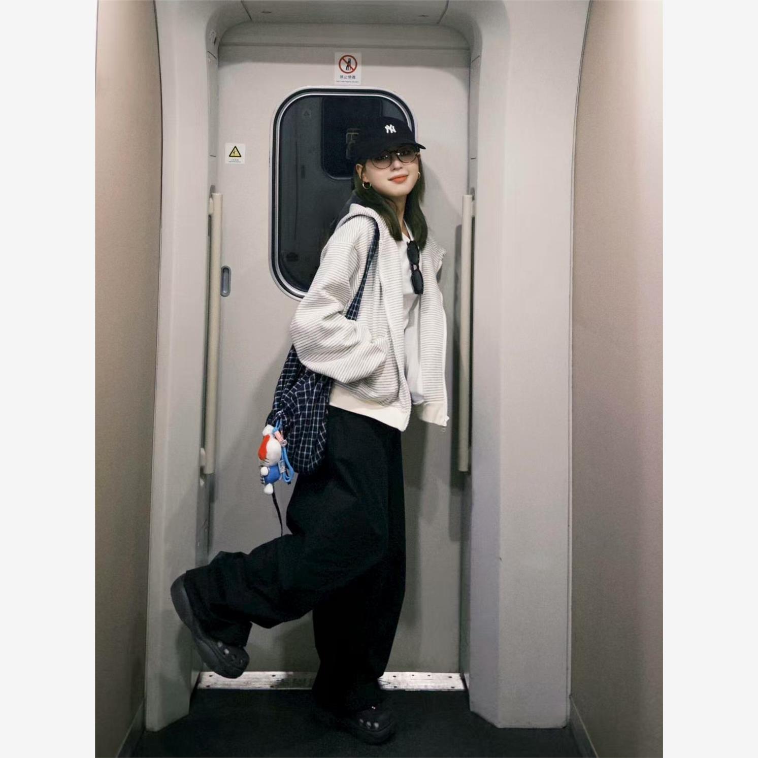 韩系慵懒风条纹拉炼连帽卫衣外套女2025新款秋冬百搭显瘦开衫上衣