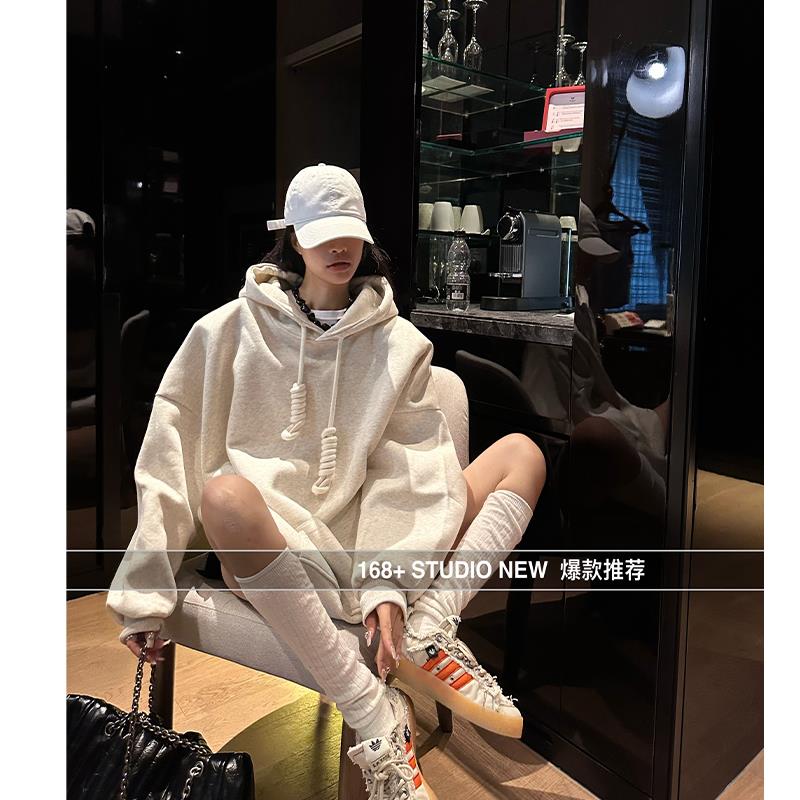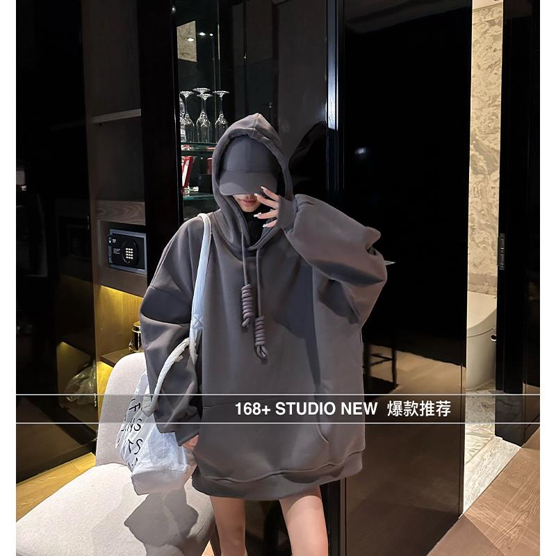 牛油果绿色卫衣女连帽大码加绒纯色粗绳大帽衫长款遮屁股下衣失踪