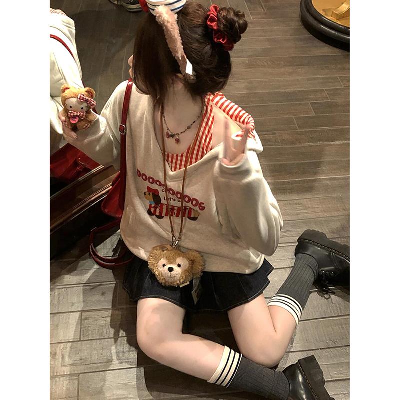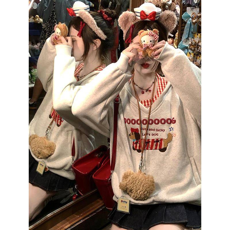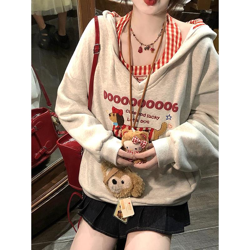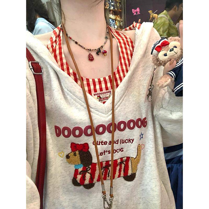 拼接格纹V领卫衣女秋冬2025新款甜美学院风小个子挂脖内搭两件套