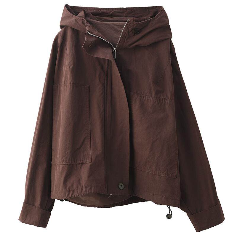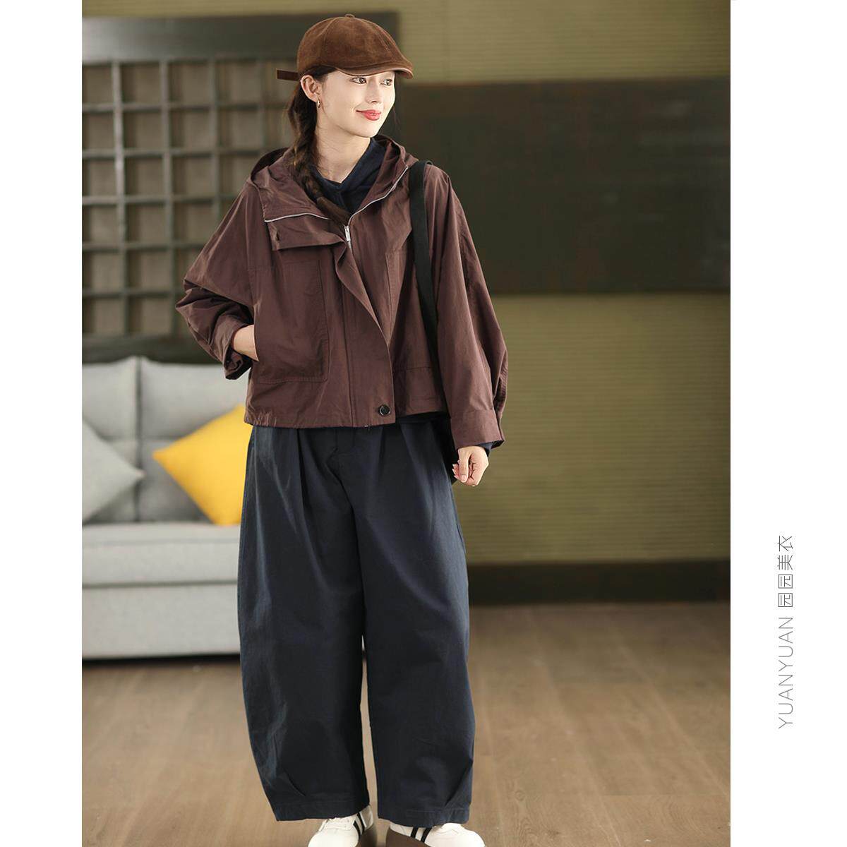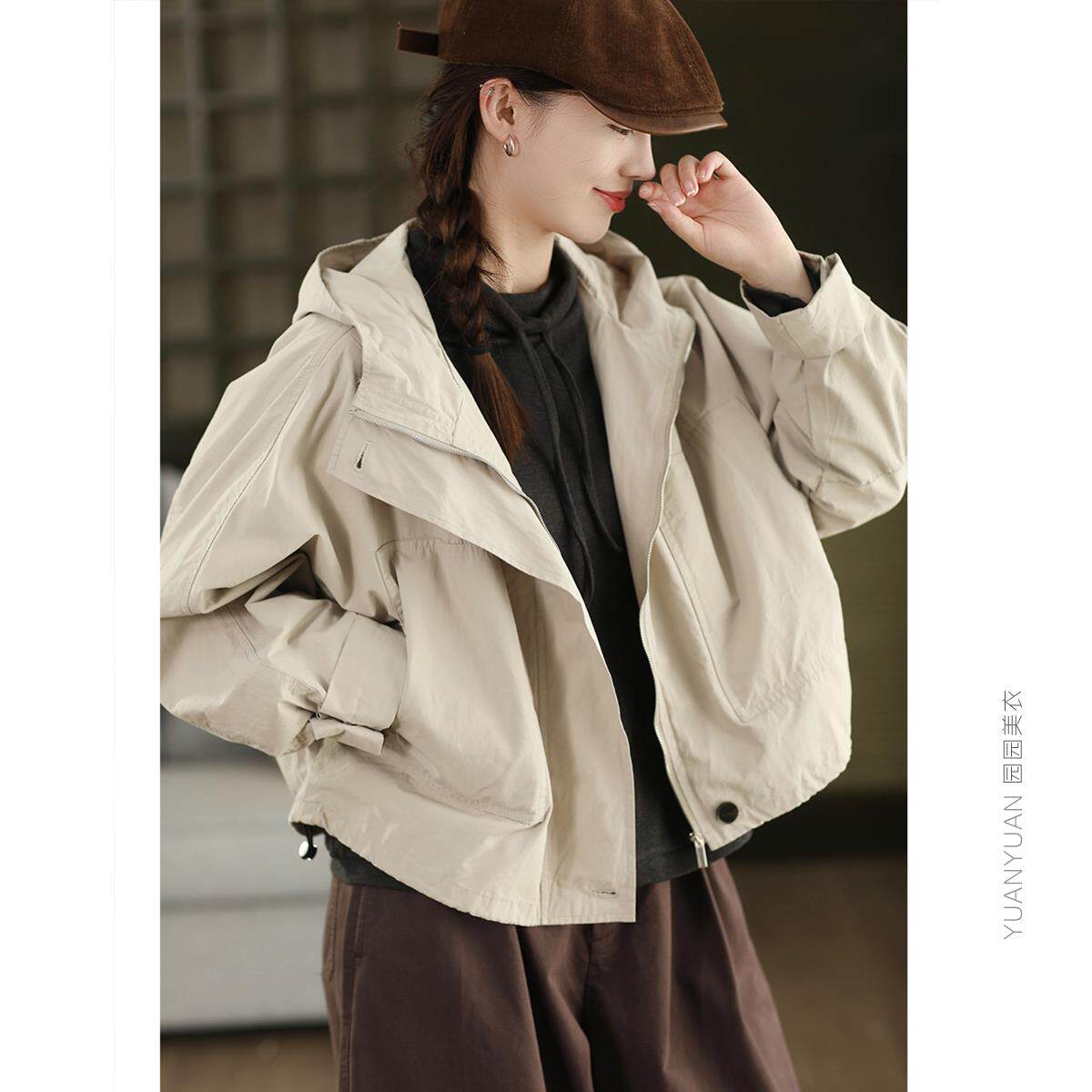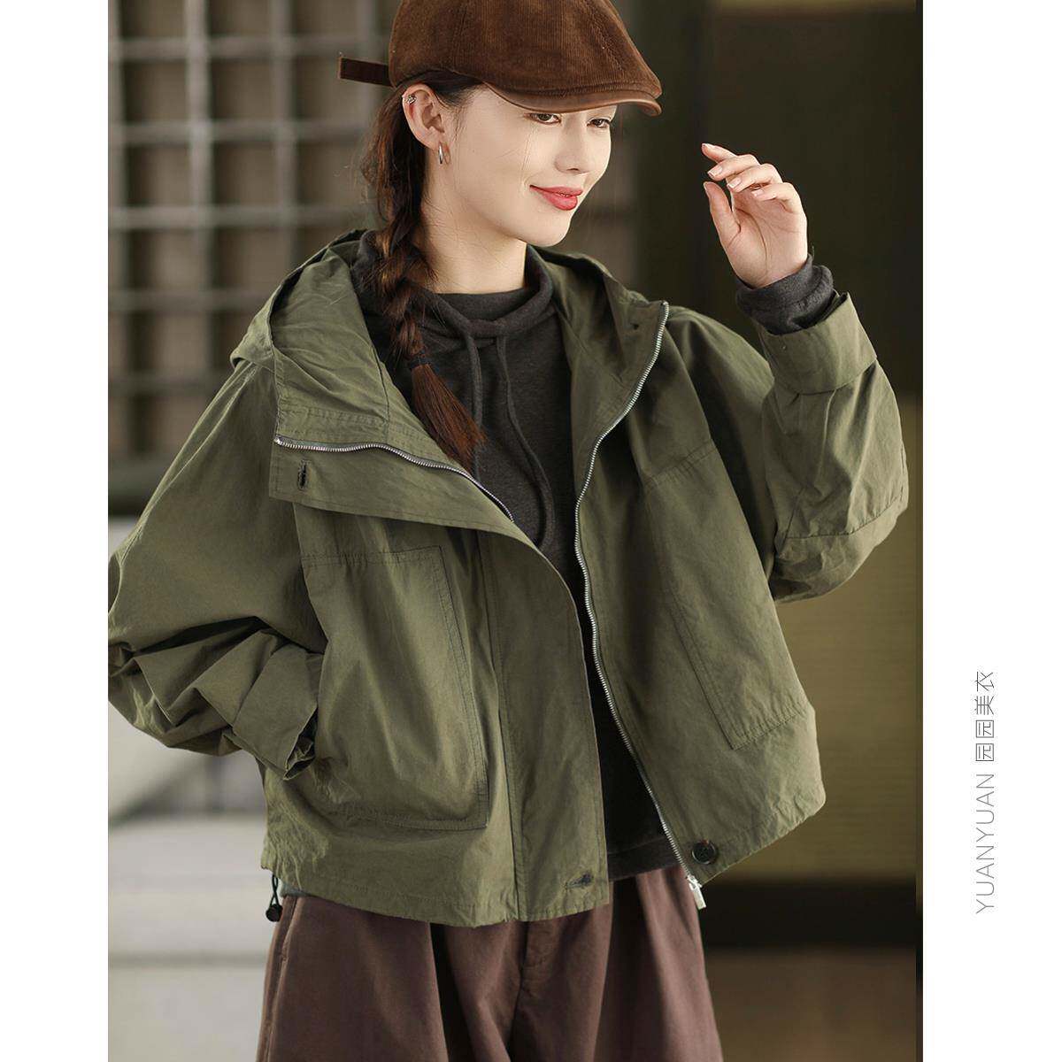 园园美衣复古100%棉连帽风衣外套女宽松显瘦抽绳摆开衫外搭夹克