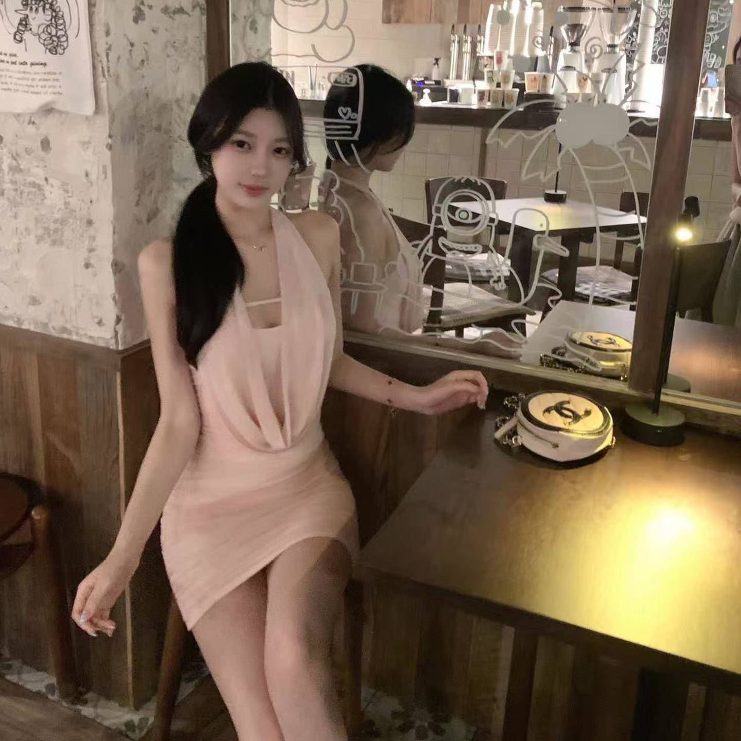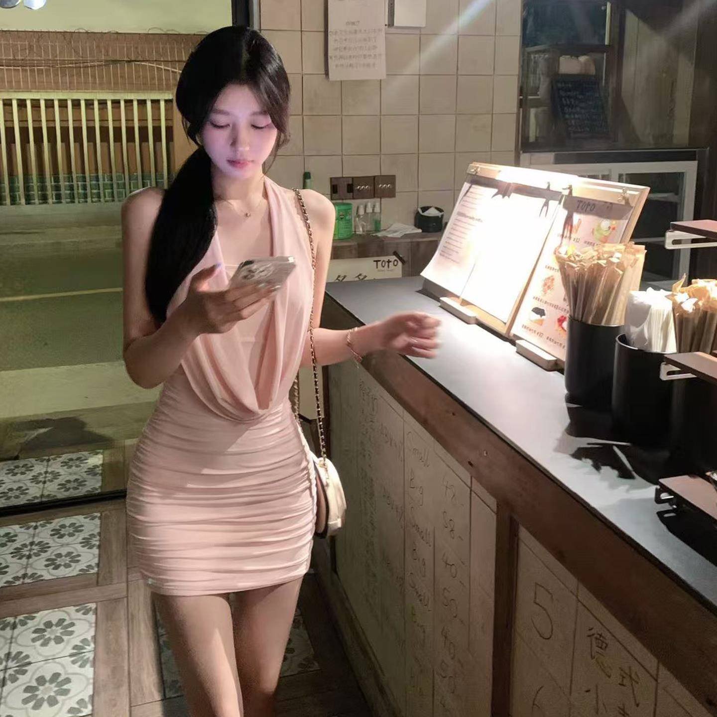 盘盘【恋爱冲突】垂折领褶皱挂颈吊带洋装女夏季修身包臀短裙子
