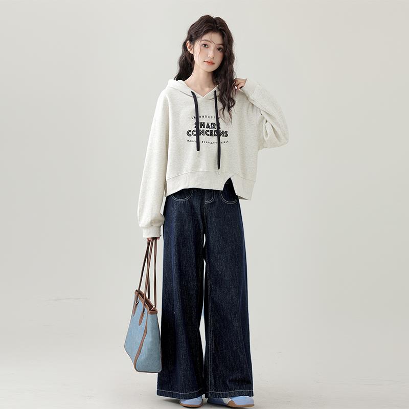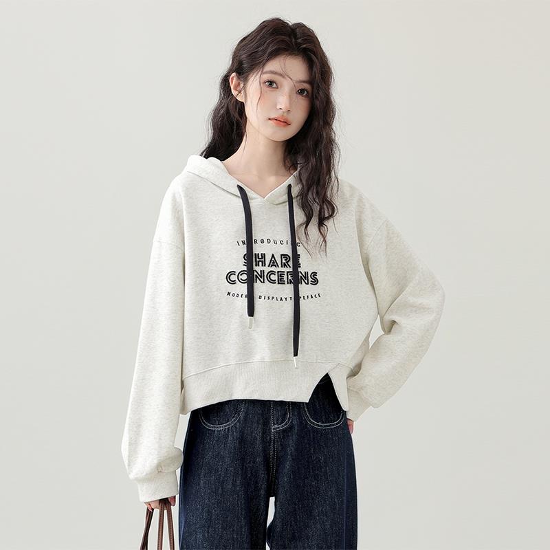 帛卡琪2025春秋新款抽绳连帽卫衣女字母刺绣不规则开叉短外套上衣