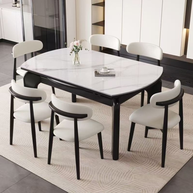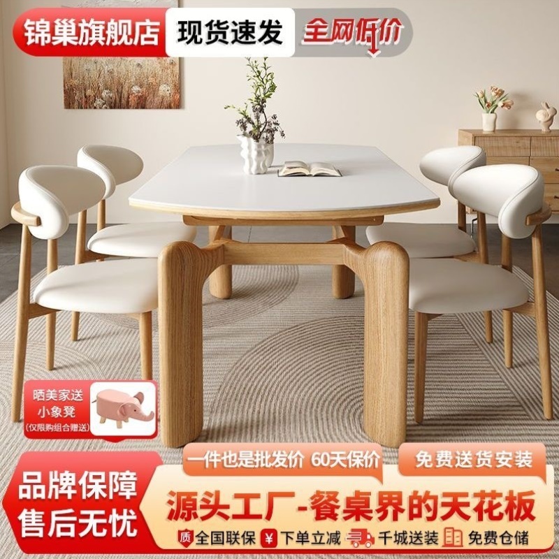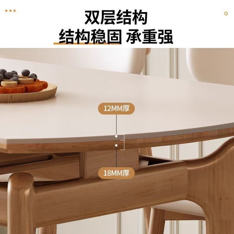 奶油风岩板餐桌椅组合电磁炉方圆两用可伸缩圆桌家用户型实木饭桌