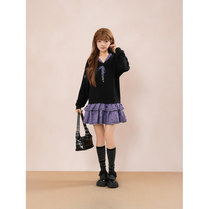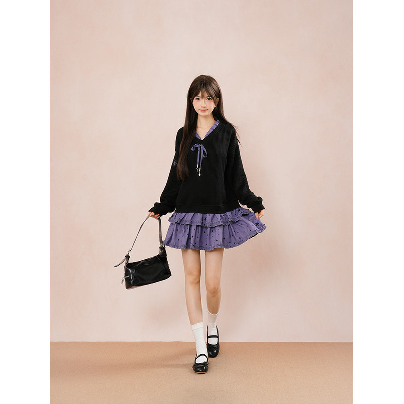 黑化次元 秋冬新款日系哥特风万圣节小魔女黑紫针织拼接连衣裙子