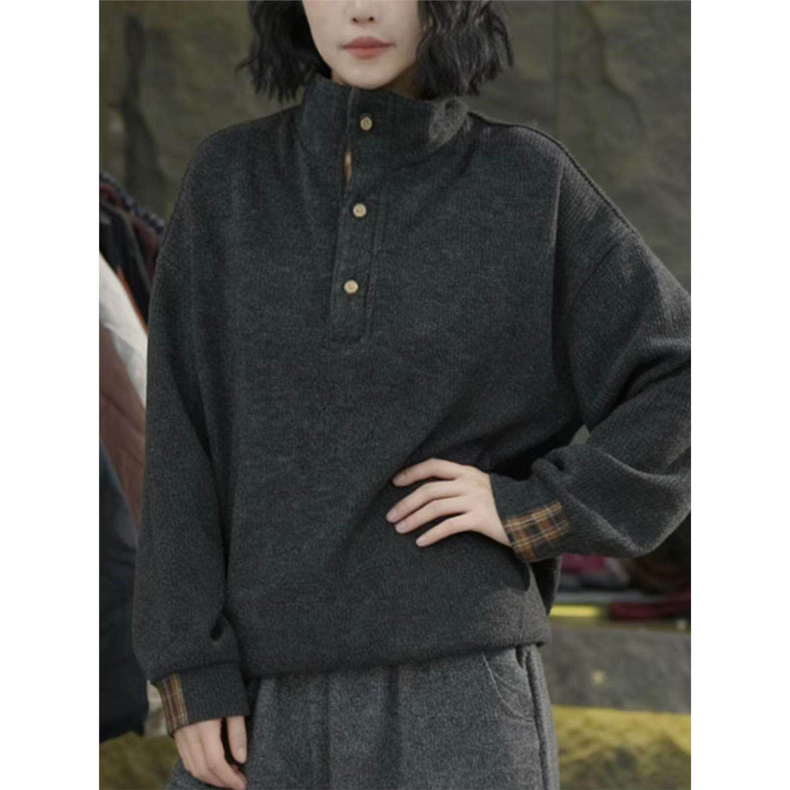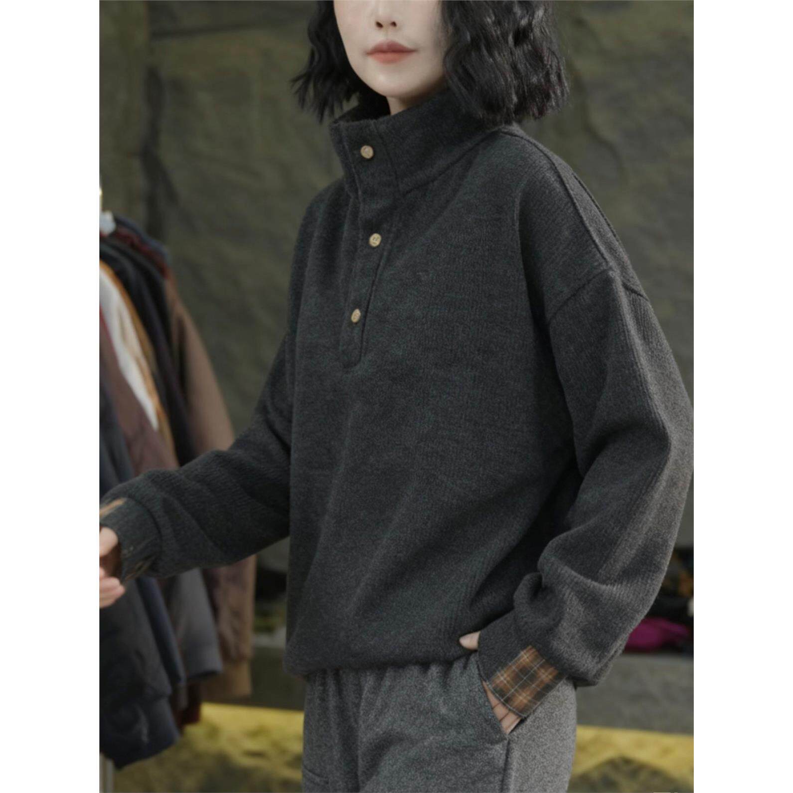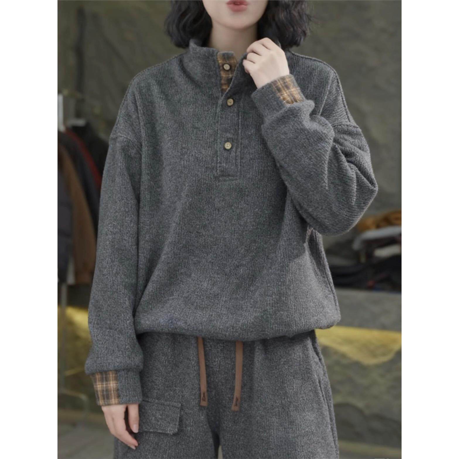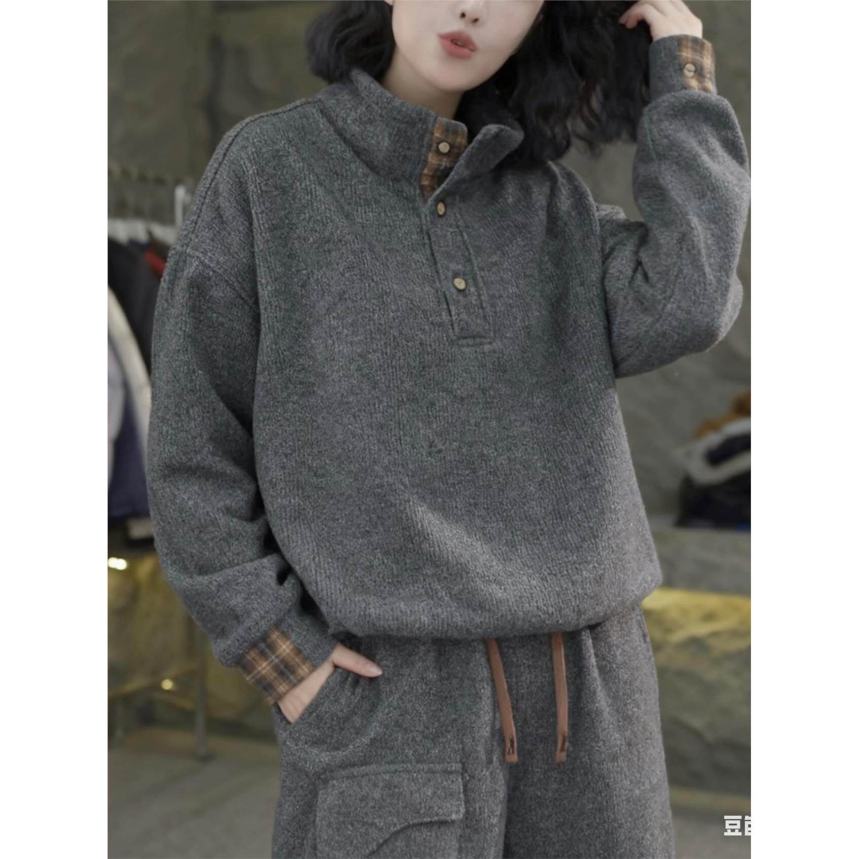 纯色加厚奥粒绒拼接格子立领卫衣女2025秋冬新款宽松百搭抽绳上衣
