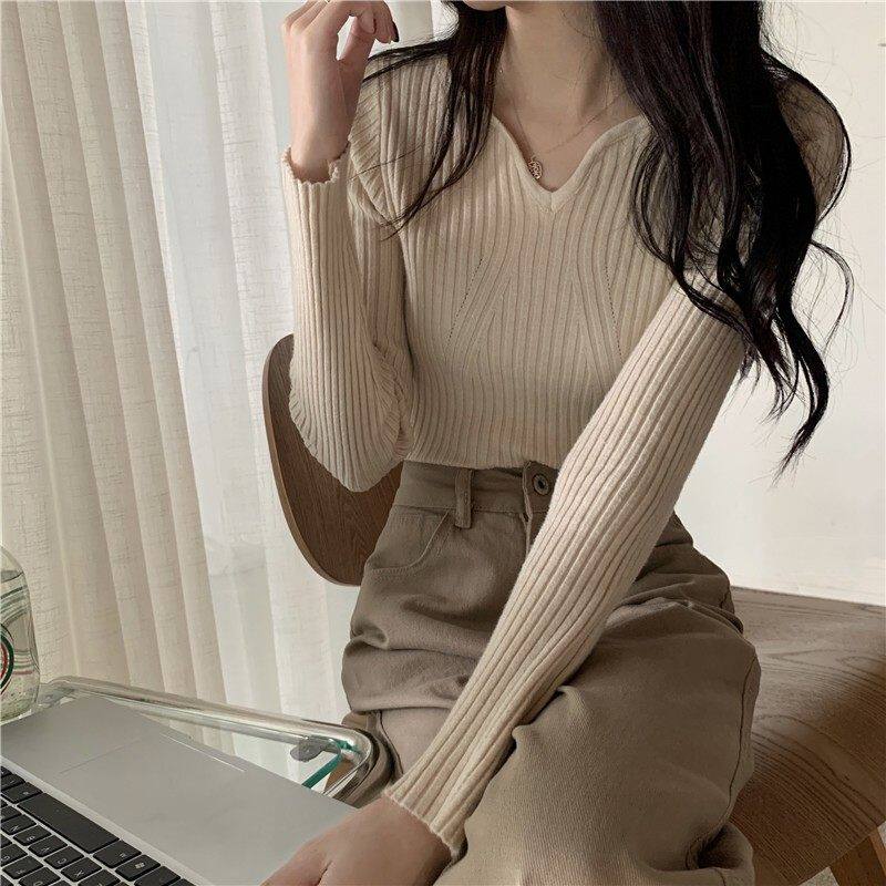 低领黑色打底衫女内搭秋冬紧身显瘦毛衣V领坑条针织衫别致上衣潮