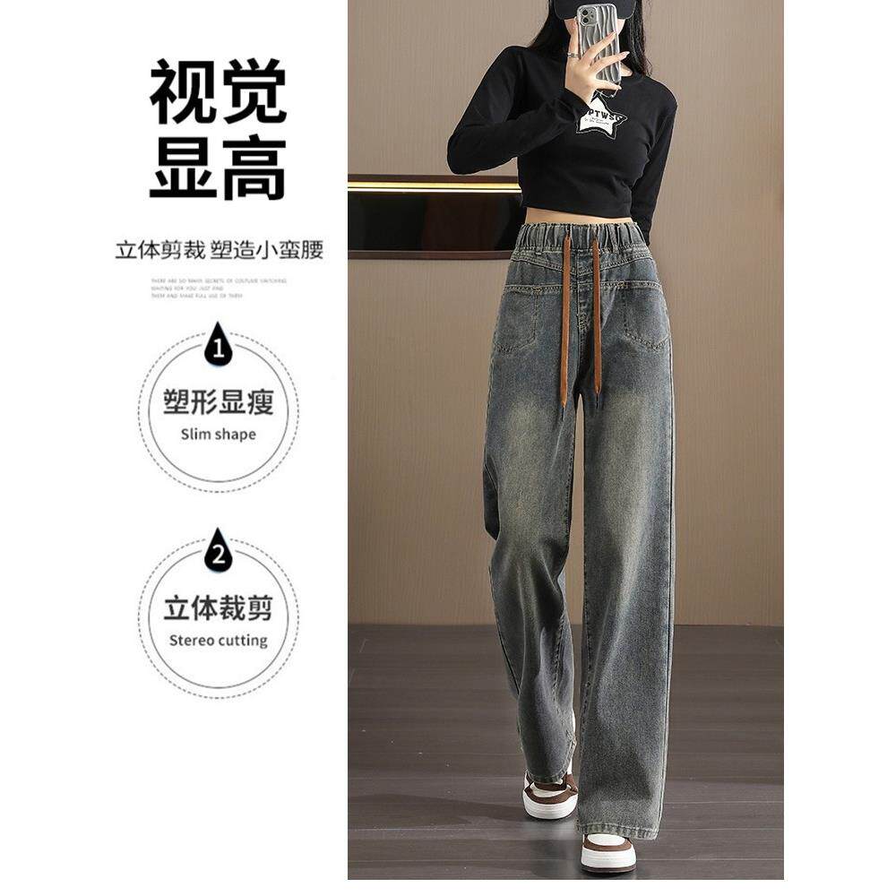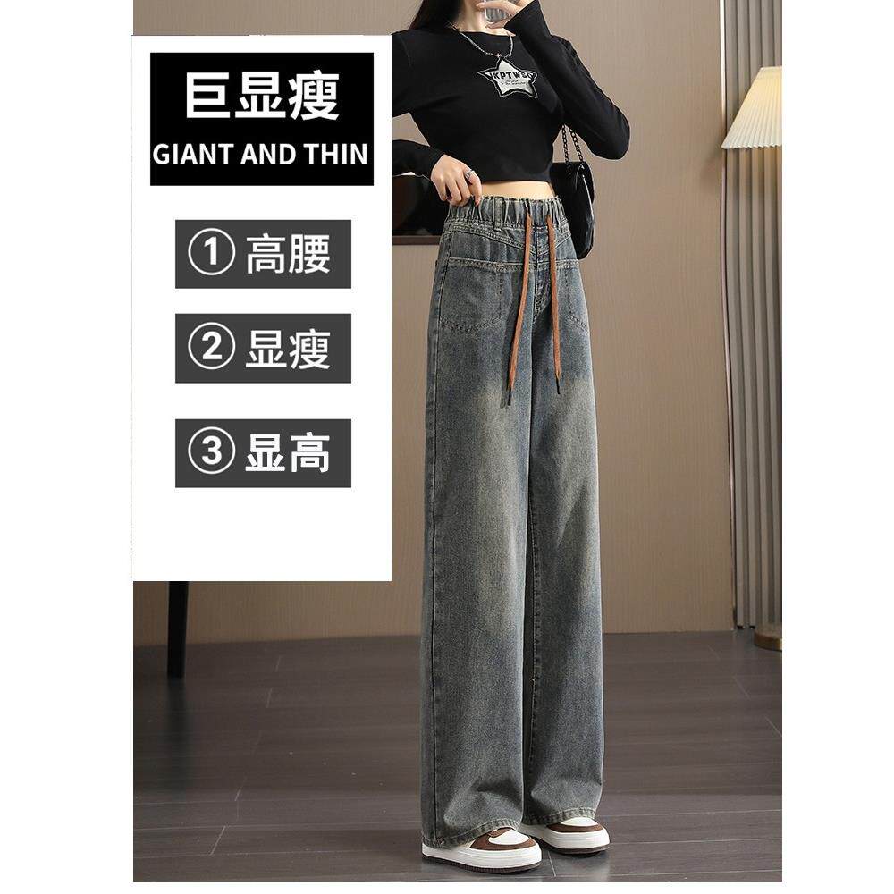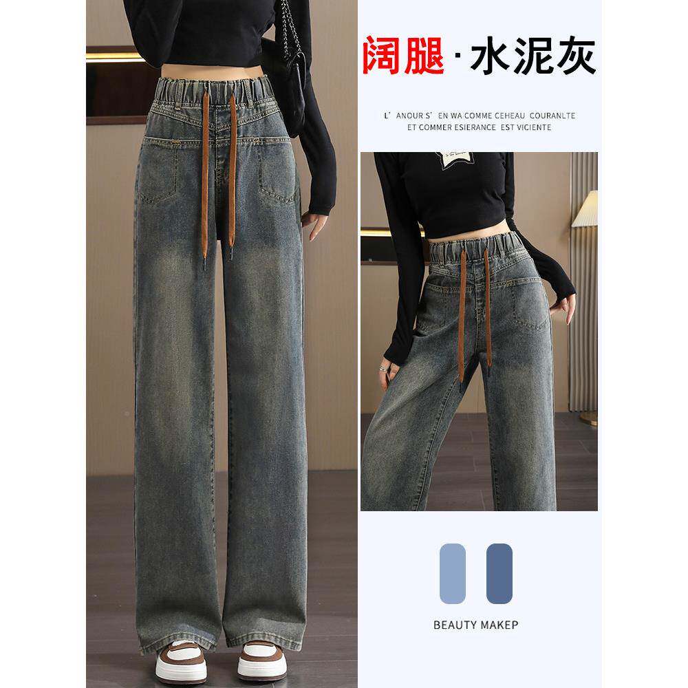 水泥灰阔腿牛仔裤0女H88012#3高腰春225新款直松紧腰大码筒拖秋地