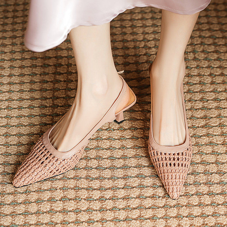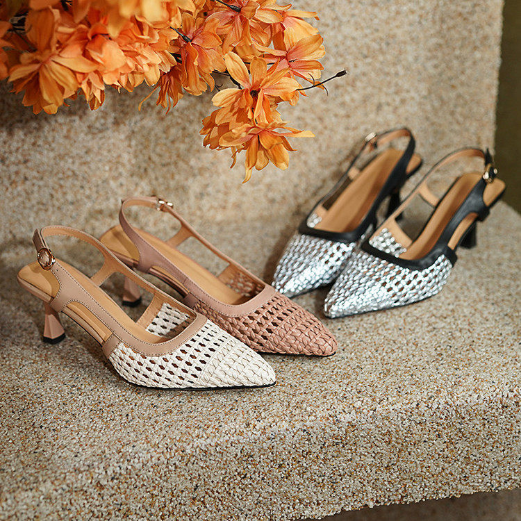 欧洲站夏季小众设计感法式透气包头镂空编织气质高跟凉鞋女配裙子