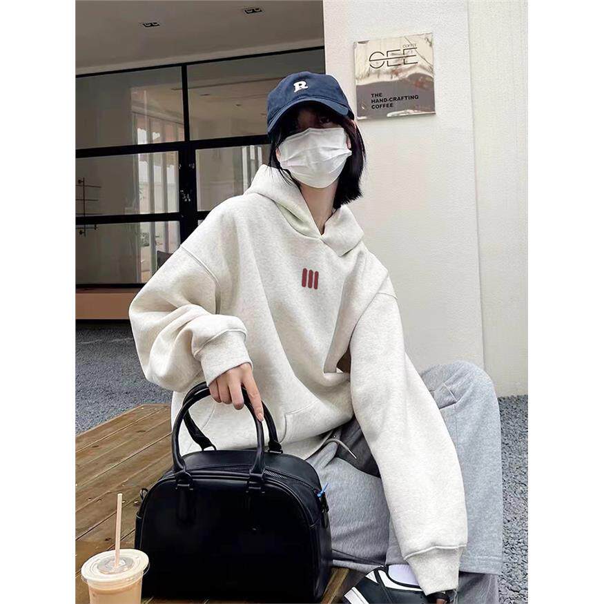 美式慵懒风设计感韩系宽松花灰色连帽卫衣女2025秋冬新款加绒上衣
