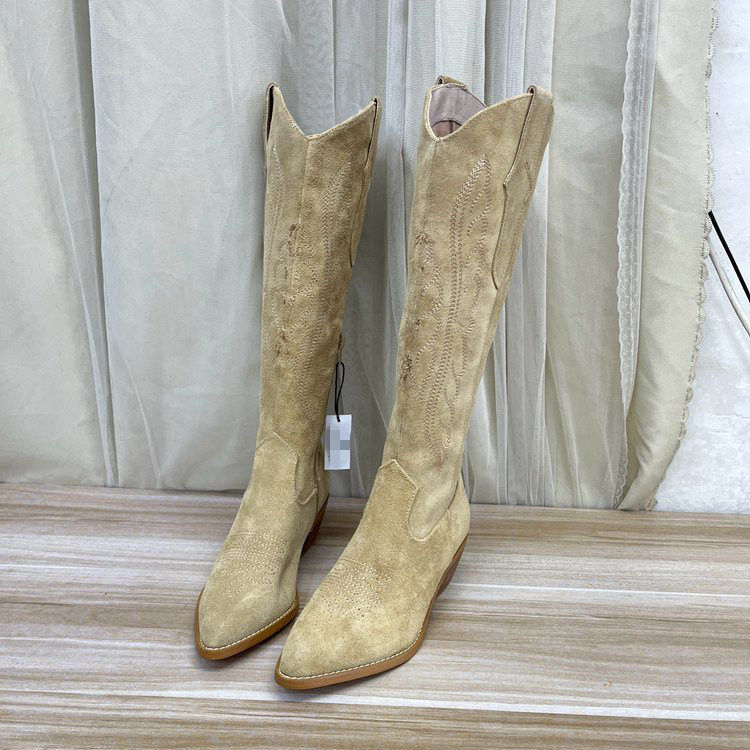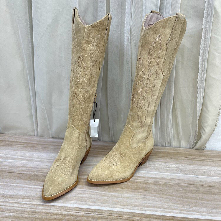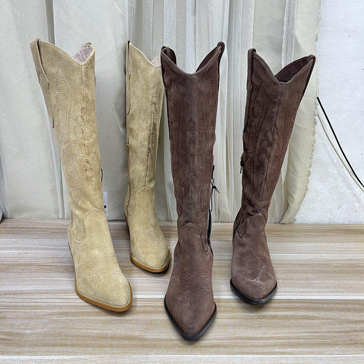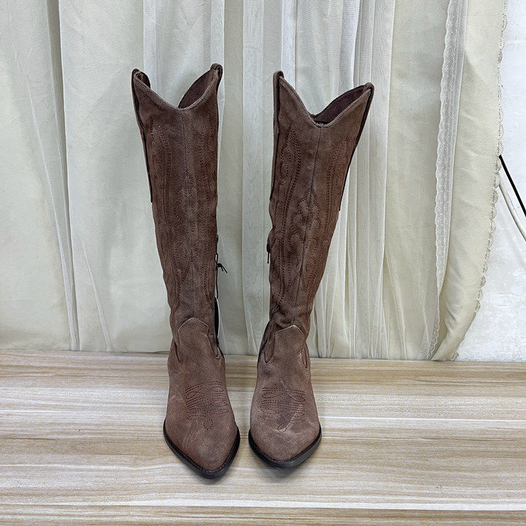 Lady Shoes外贸原单女靴真皮微瑕时尚尖头纯色粗跟侧拉链时装长靴