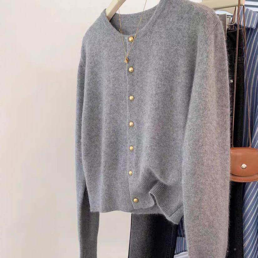 羊1200%纯开衫女圆领205春毛秋灰色针织毛衣外2304套高腰显瘦外搭