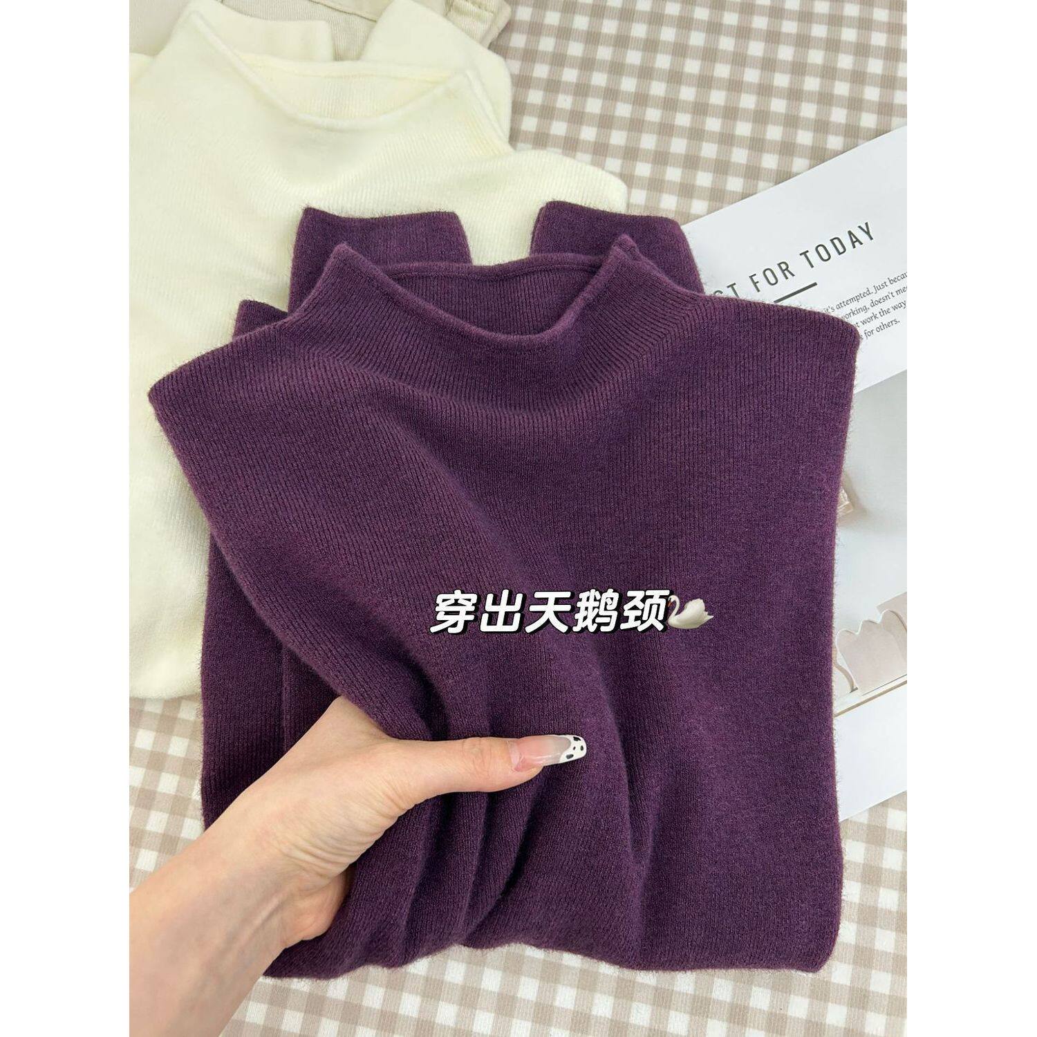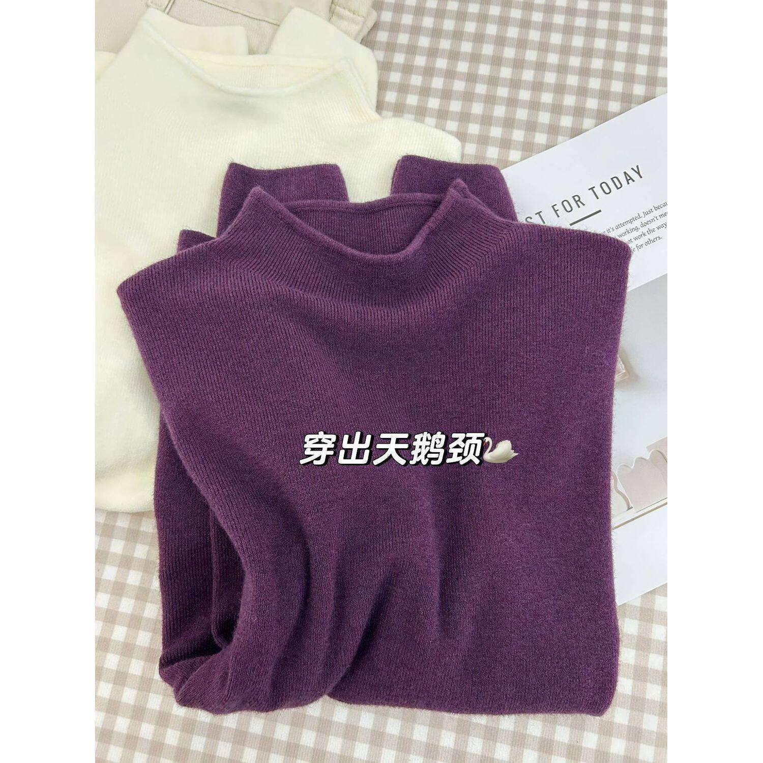 2025新款修身显瘦软糯高级感葡萄紫色半高领针织长袖女打底衫上衣