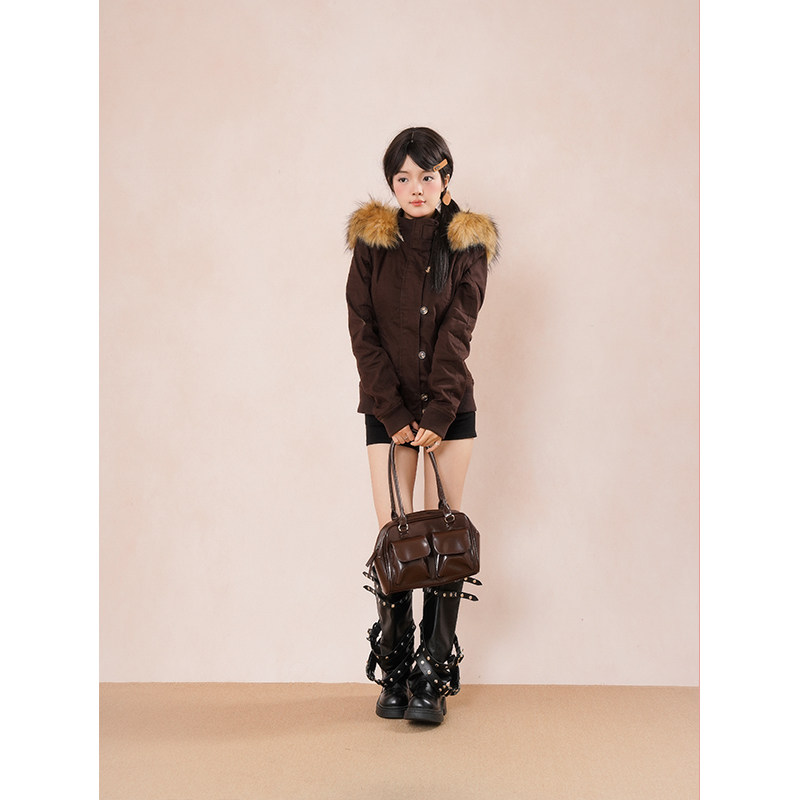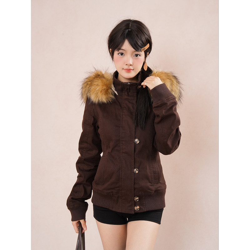 古着vintage连帽毛领外套秋冬新款设计感小众复古收腰修身夹克女