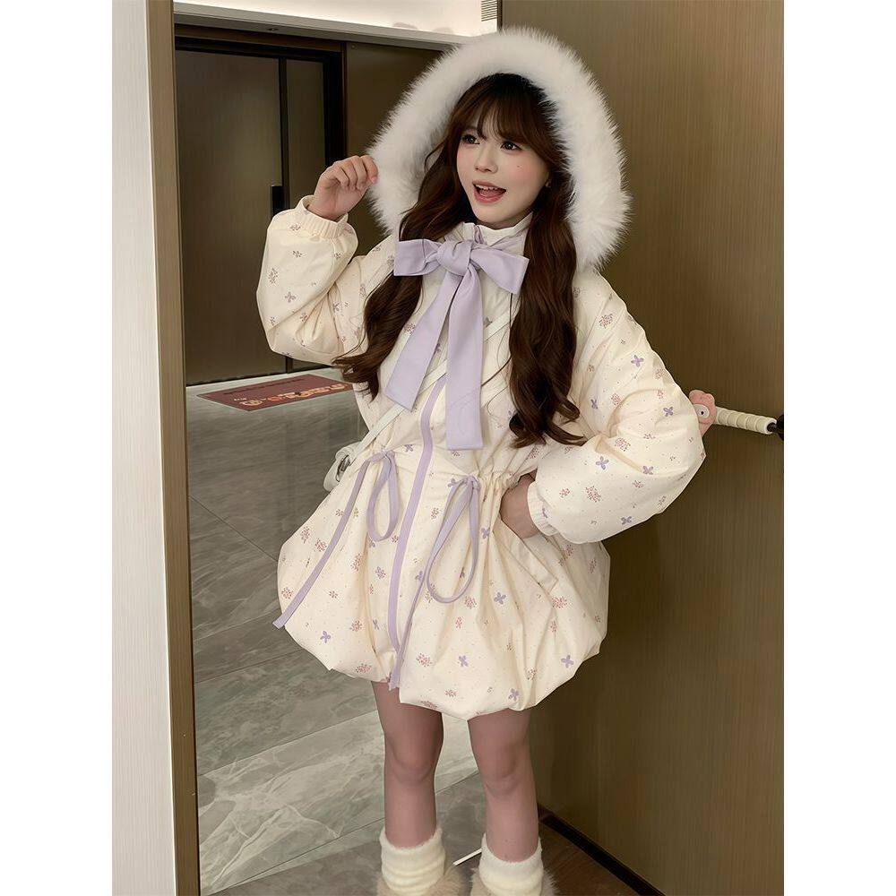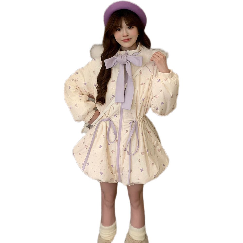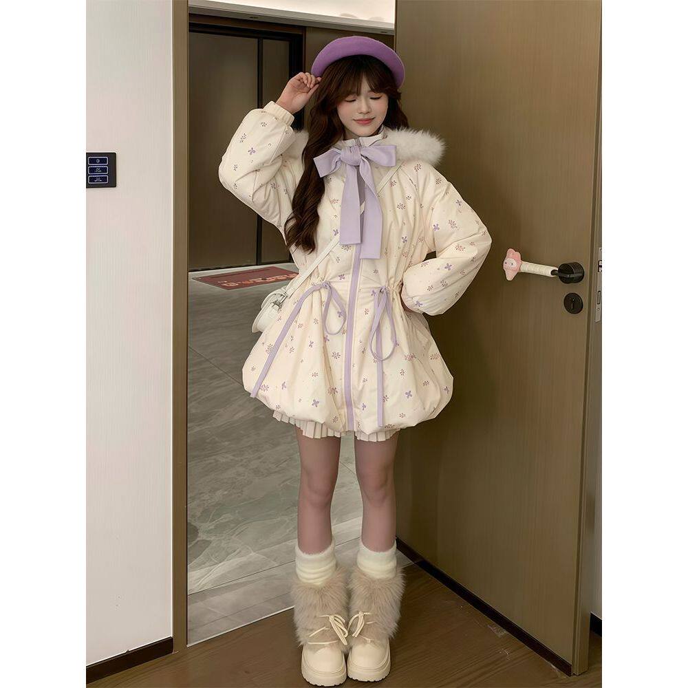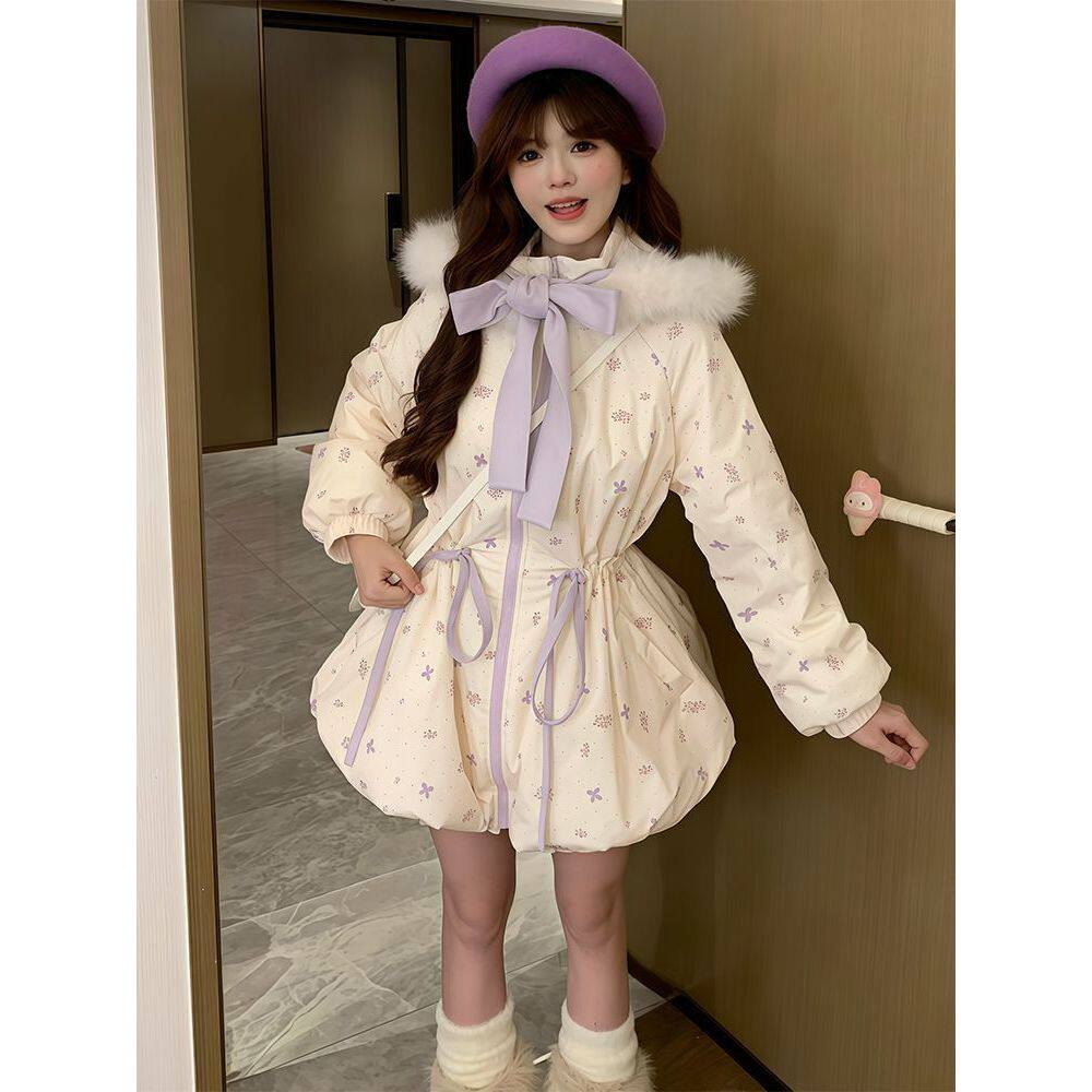【紫芋丁香】甜美风碎花中长款棉服小个子冬季保暖清新抽绳外套女