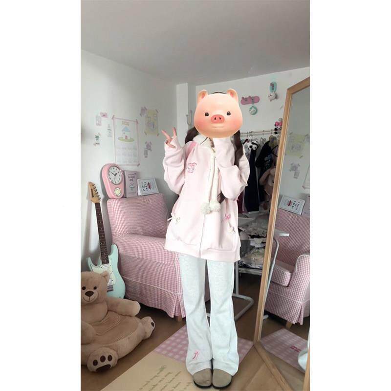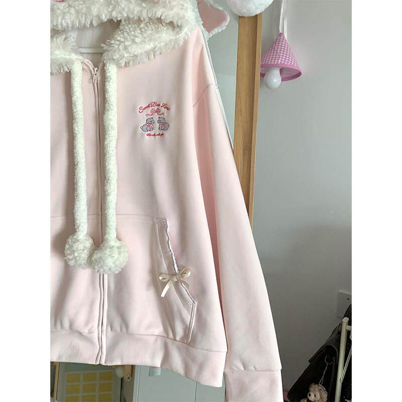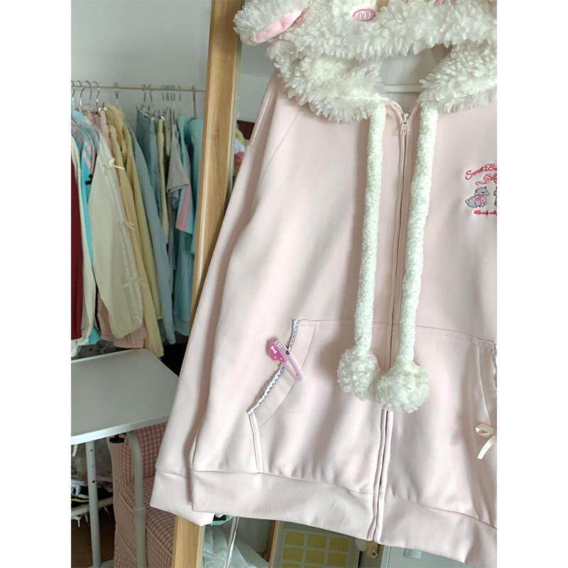 可355卫爱刺绣小连绵羊衣女春秋甜美软妹学子院宽松小个羊羔毛帽