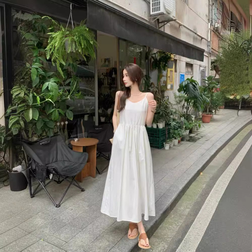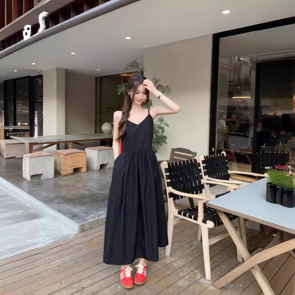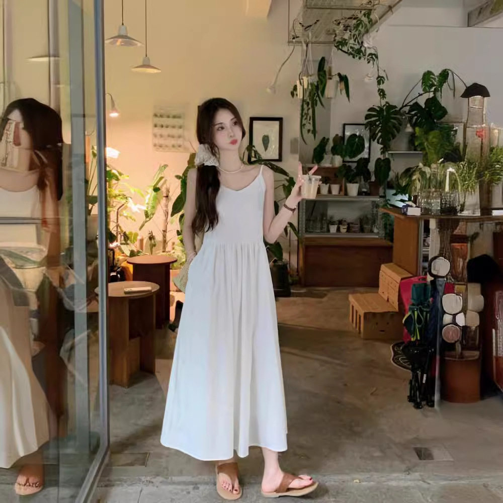实拍2024法式简约温柔风初恋气质吊带V领连衣裙韩系显瘦连衣裙