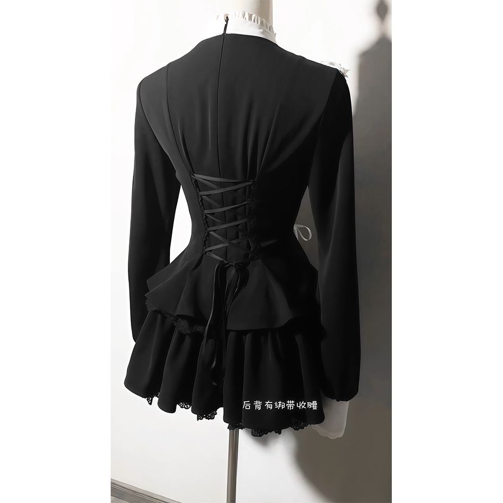小众风哥特绑带收腰古早Lolita蕾丝拼接连衣裙+短裤两件套女