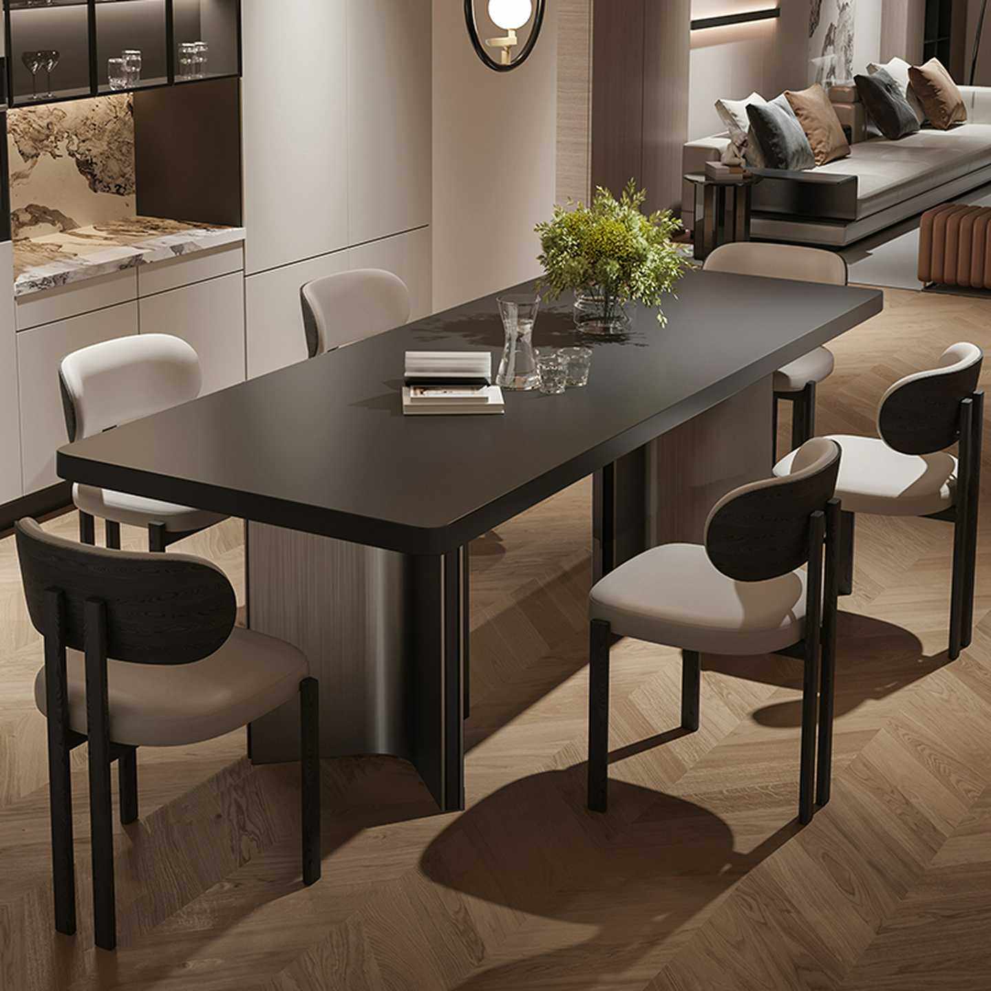 意式极简纯黑加厚岩板餐桌椅组合大户型大板桌长方形岛台复古