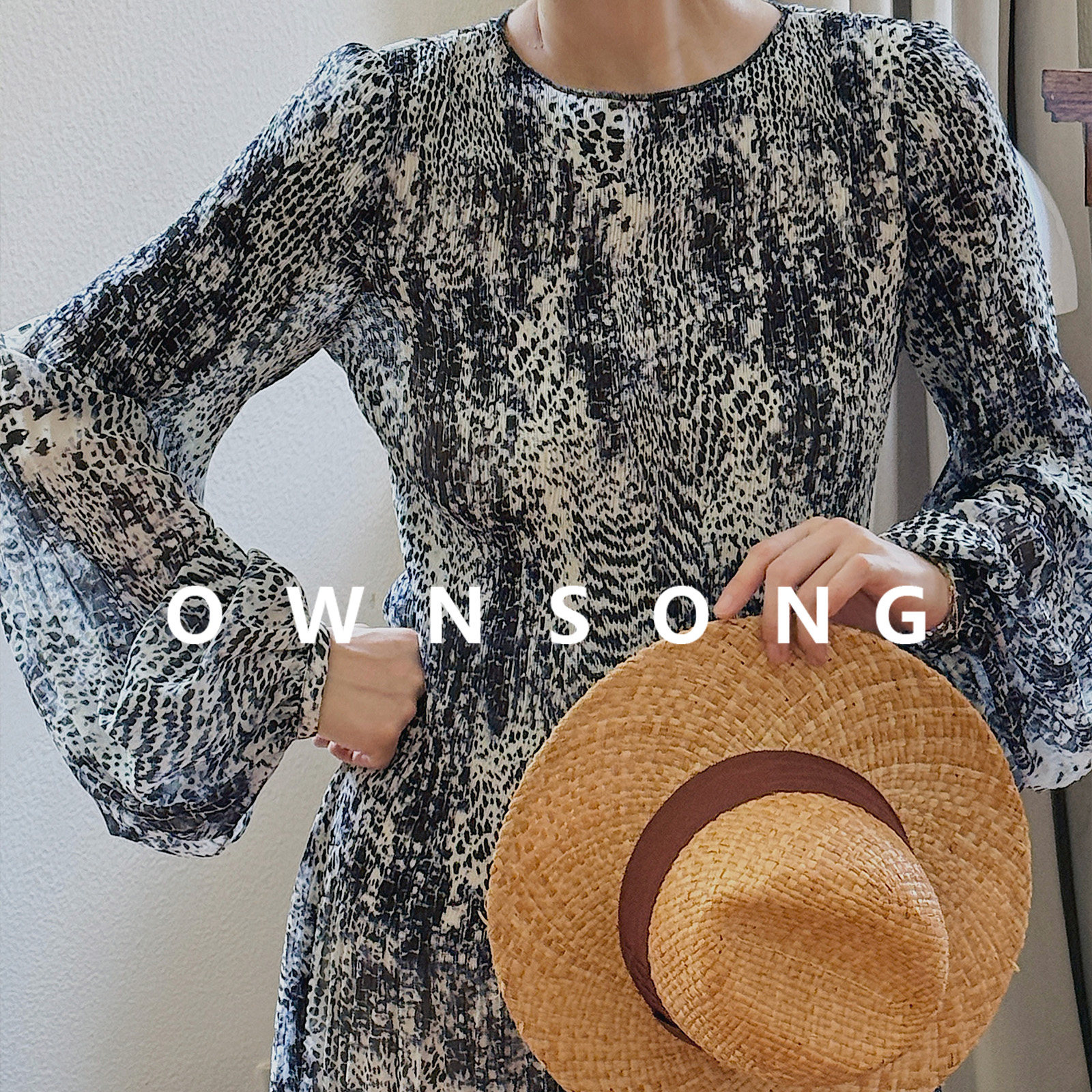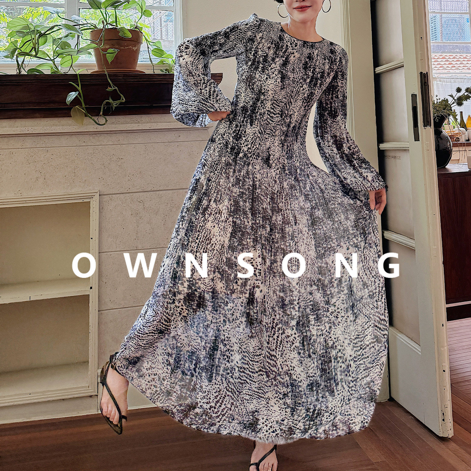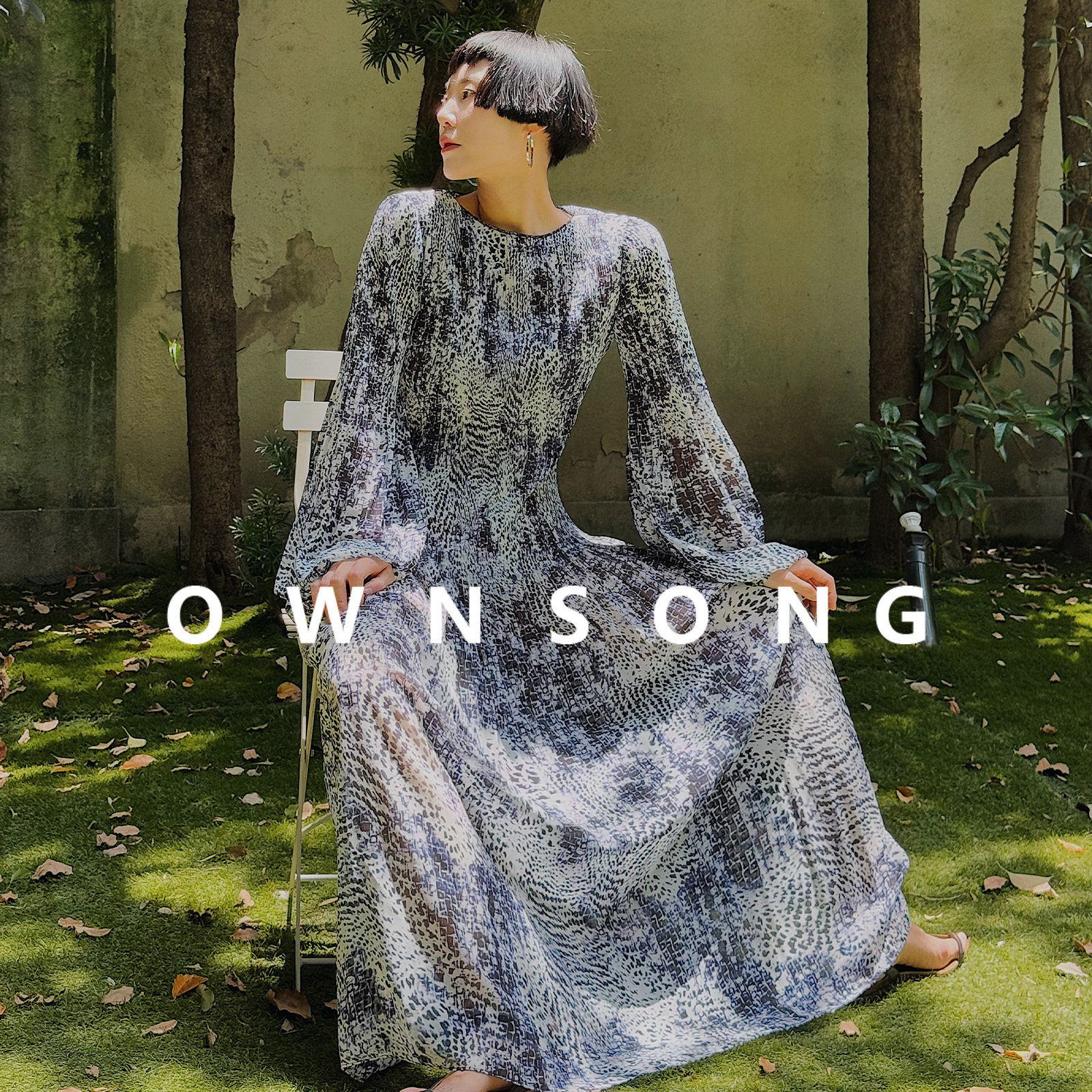 OWNSONG烟雨梦 印花连衣裙女大摆春秋夏季长袖收腰显瘦气质长裙子