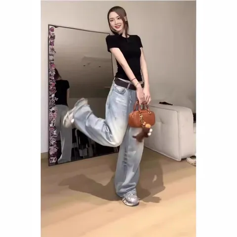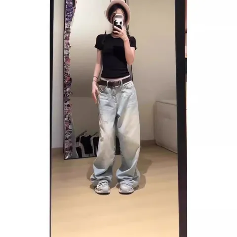 阔腿女高腰直筒裤2025年牛仔裤水洗宽松春秋季抓痕设计感显瘦磨白