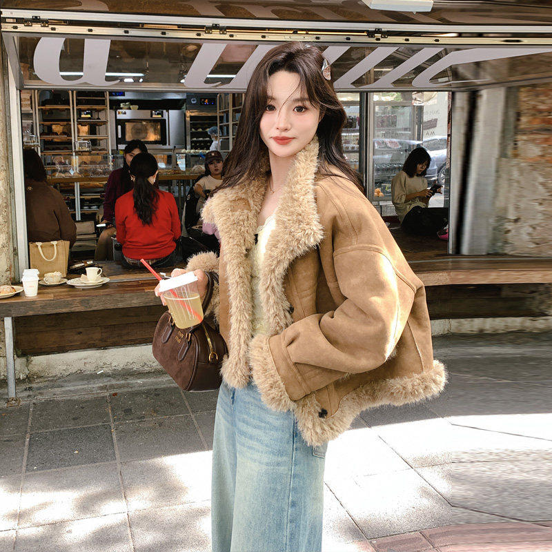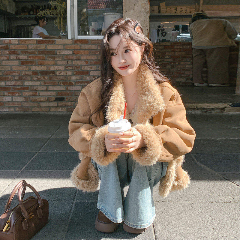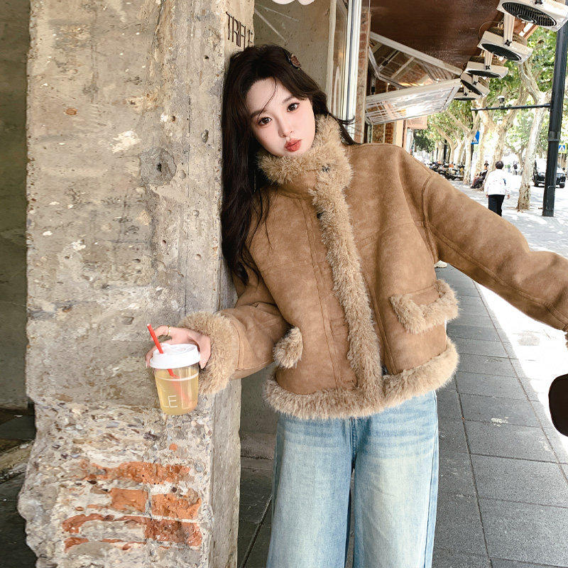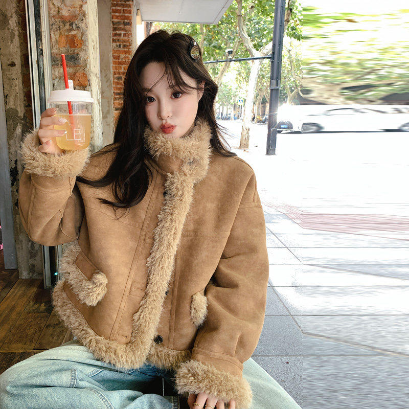 卡其色皮毛一体外套女2025冬季新款高级感超好看加厚加绒机车棉服