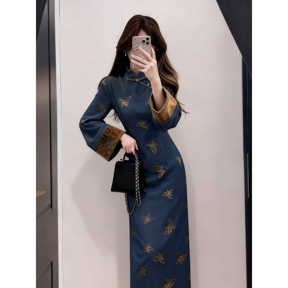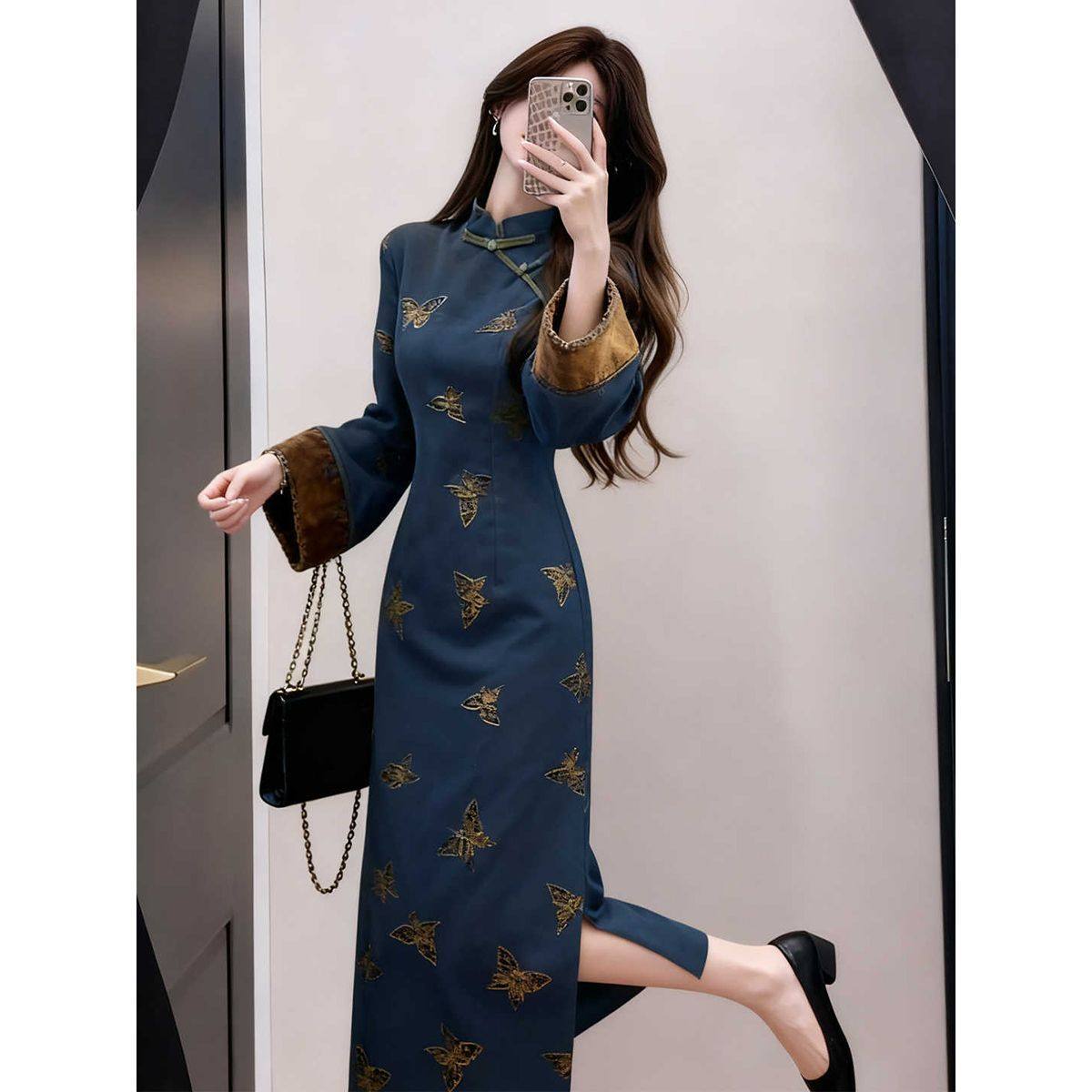 新中式复古蓝色提花改良旗袍连衣裙出席重要场合的裙子2025年冬季