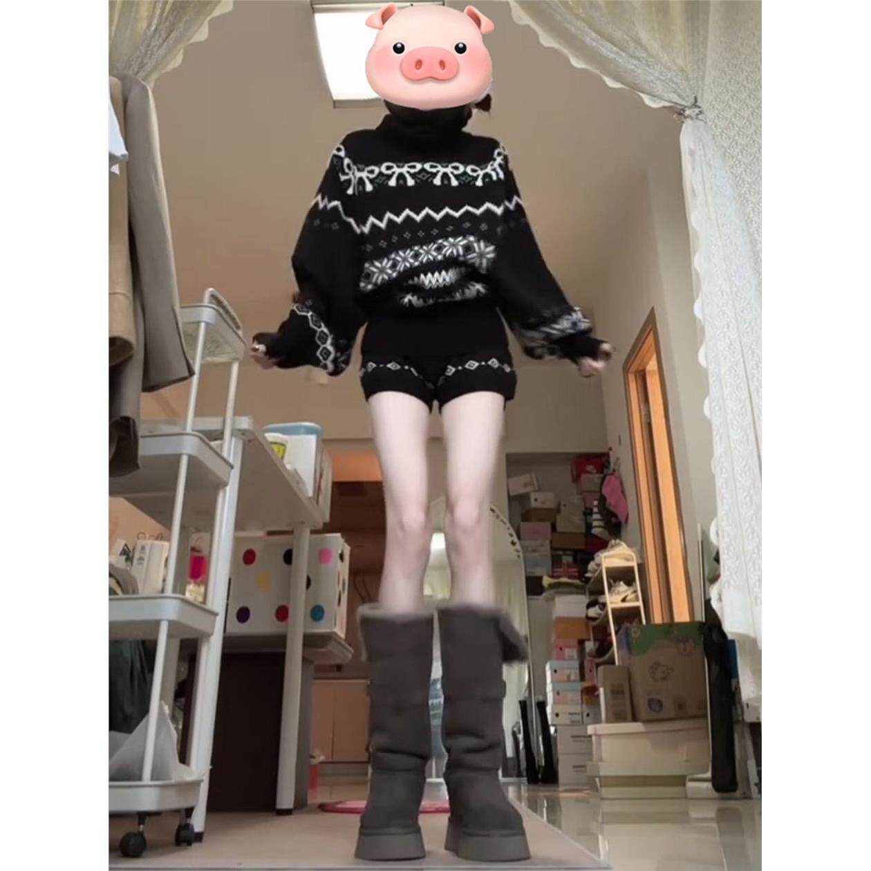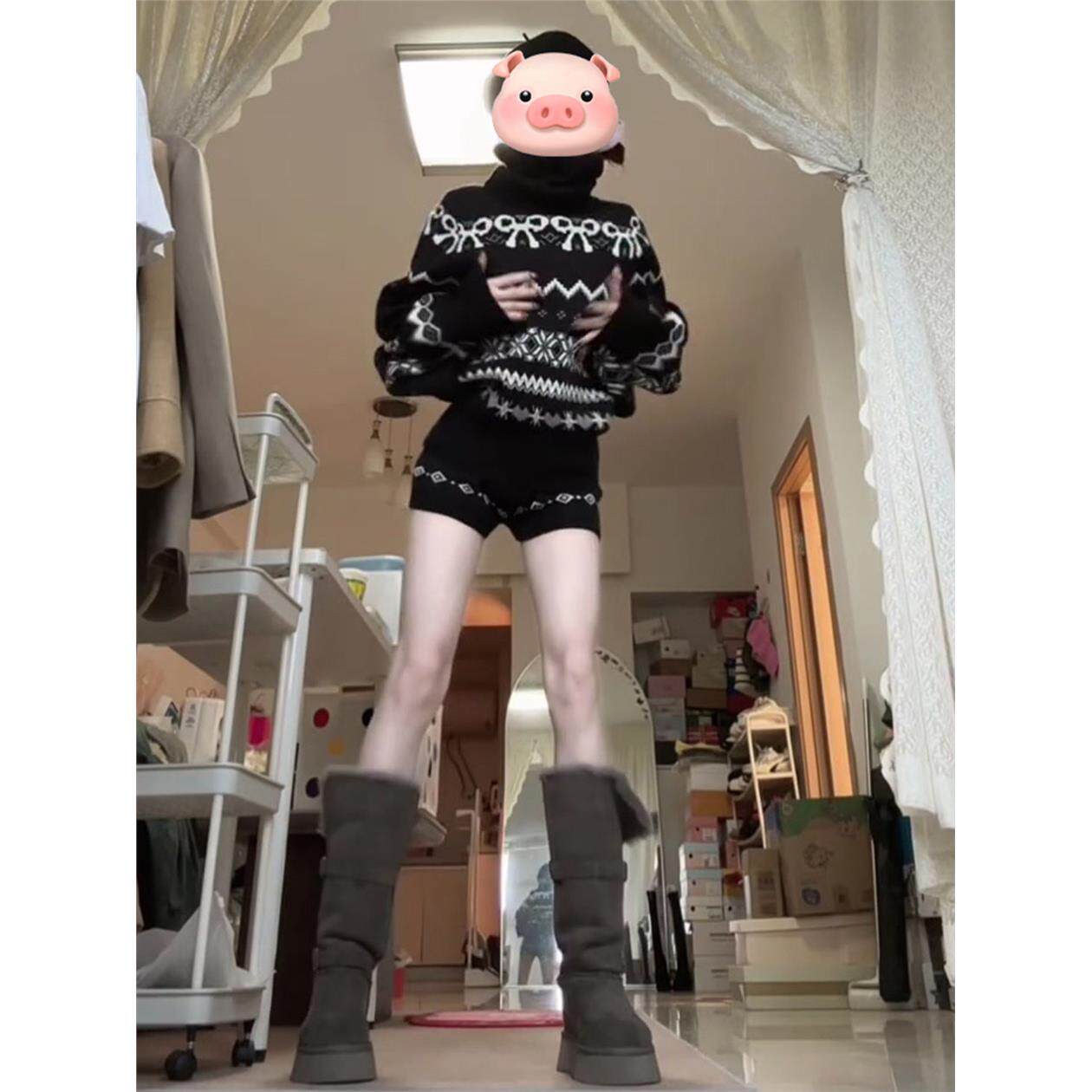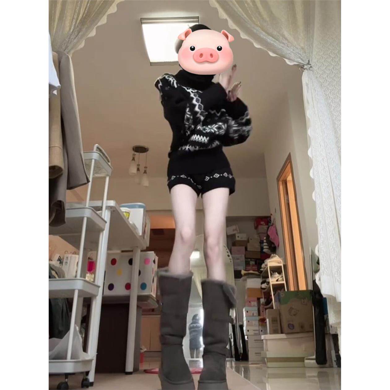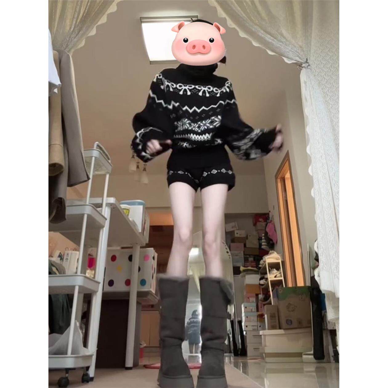 气质一整套ootd穿搭松弛感覆古黑色费尔岛毛衣短裤两件套装2025冬